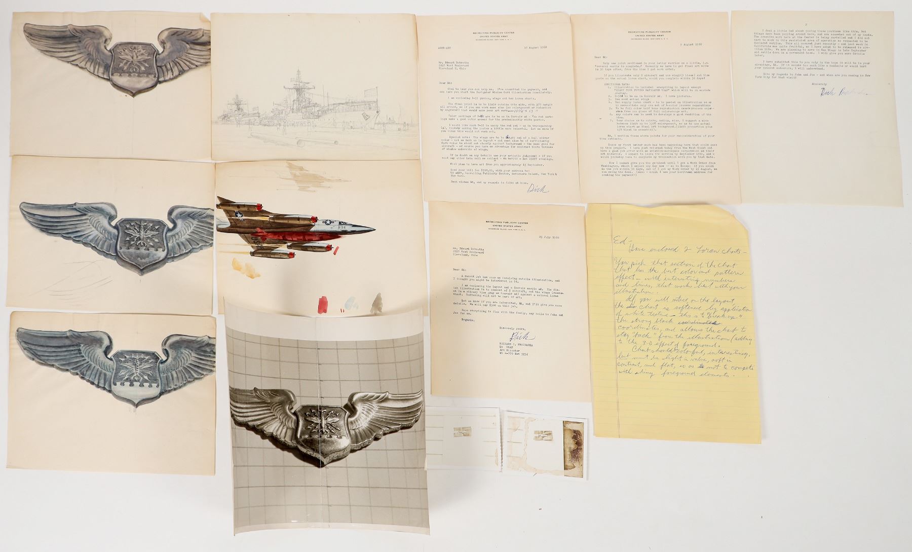 - Watercolor illustration of B-58 fighter jet and pencil illustration of warships at harbor (2 items)