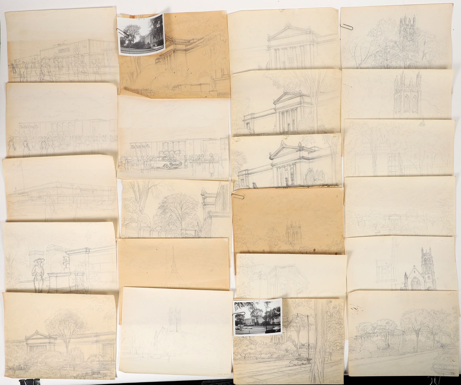 - Pencil sketches of buildings, urban outdoor scenes, and crowd scenes, varying in levels of detail/polish, along with one watercolor painting (33 items)