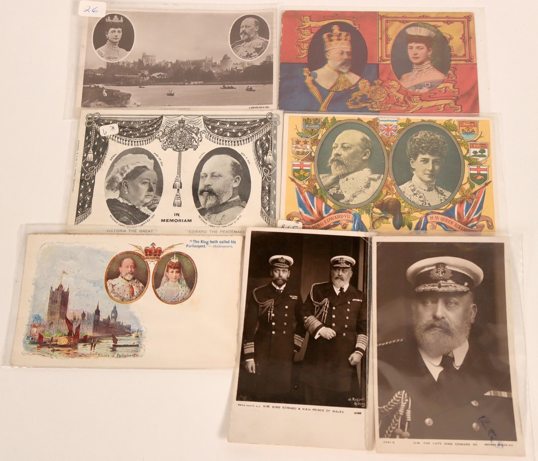 Six royal postcards; Windsor Castle; J. Beagles & Co., In Memoriam "Victoria the Great , and "Edward the Peacemaker" Prudential Life Insurance Post Card commemorative HM King Edward VII, HM Queen Alexandria ; two published by the Rapid Photo Printing Co. Ltd., London , and the rotar Photgraphic Series 2451B King Edward Vii