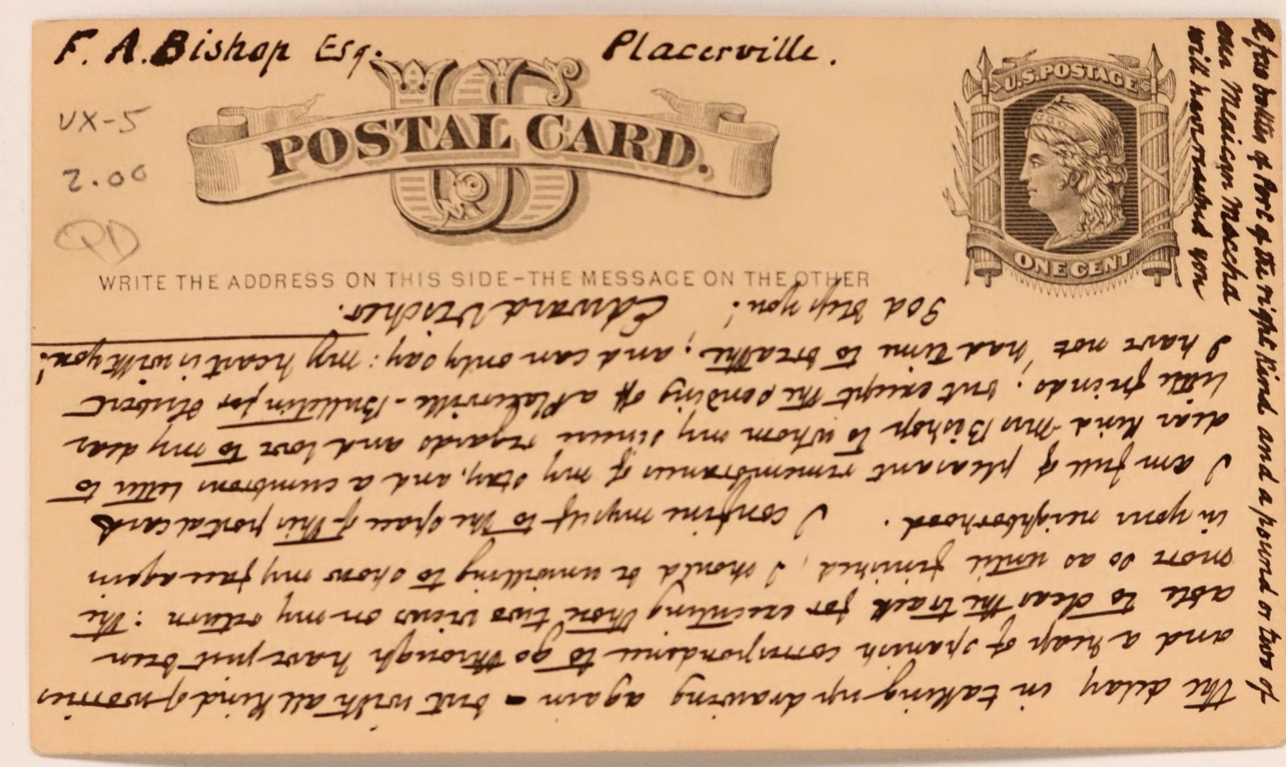 Postal card datelined Placerville from Edward Vischer to F.A. Bishop, Esq. dated 1878. The message details a visit by a committee including Jno. O. Earl to investigate the entire canal enterprise. Vischer mentions the "high glee" in those quarters of securing the $10 million investment and an upcoming glance at the hydraulics before a return to the city. Edward Vischer was a San Francisco merchant, but was best known as an artist of California scenes. His account of visits to the Northern and Southern mines is illustrated with sketches showing the methods of mining (Gudde, California Gold Camps). It appears that Vischer had been commissioned to view the canal and the hydraulics and to do two drawings. Nice clear signature by Edward Vischer. Many of the rich placer mines near Placerville were hydraulicked producing $25 million or more. The principal gravel channels around Placerville are described and mapped in Lindgren's "Tertiary Gravels". Hydraulic mining ended in 1884 in California by federal injunction.