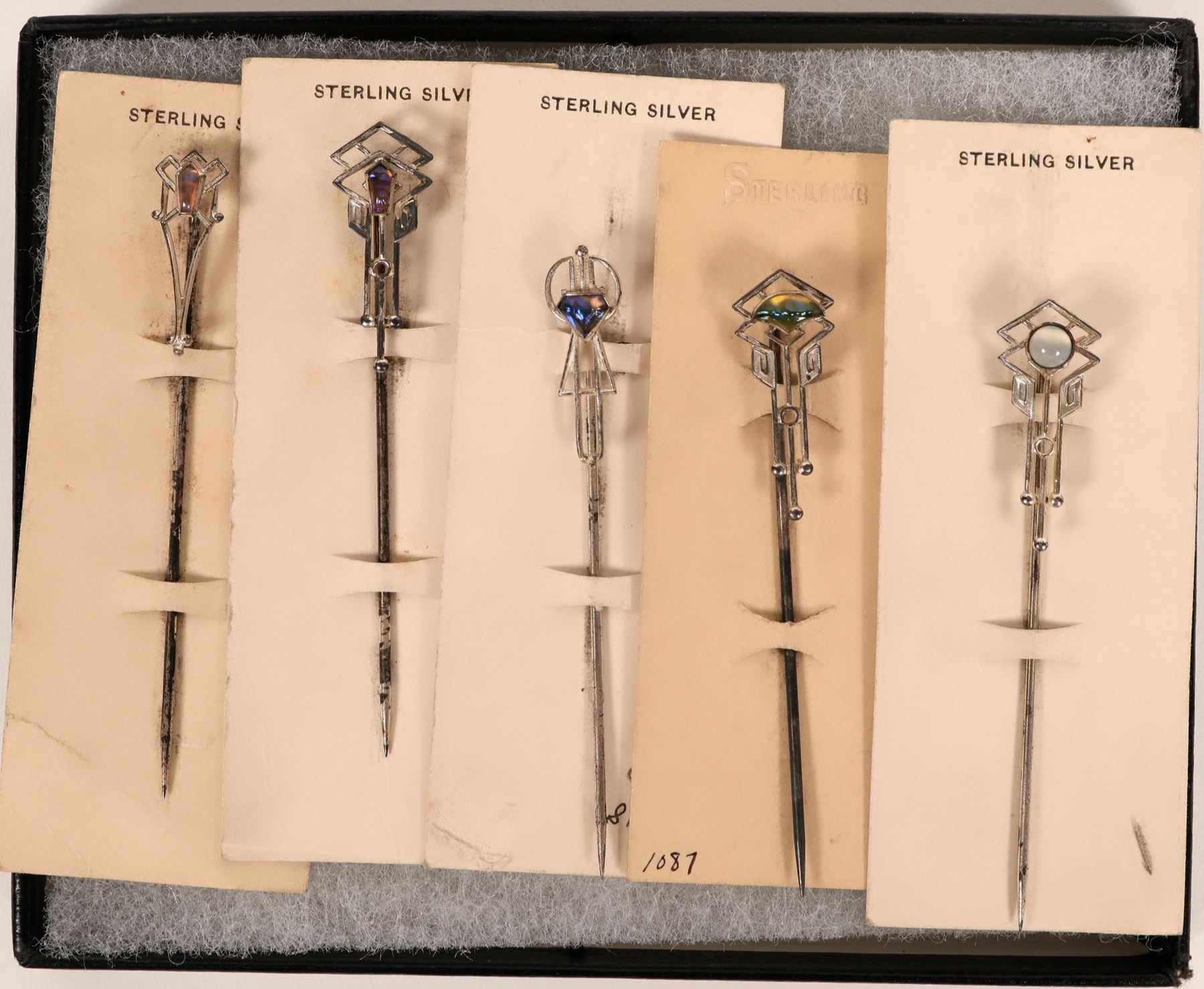 5 Vintage Sterling silver stick pins all feature a jewel resembling semi-precious gemstone varieties including moonstone, opal and citrine. Very attractive, classic Edwardian style stick pins. Classy, not gaudy. Nice starter collection.