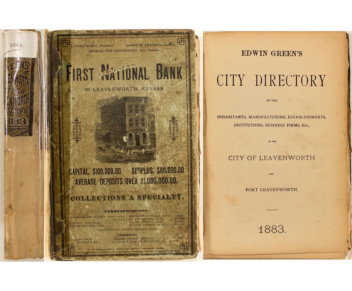 City directory of the "inhabitants, manufacturing establishments, institutions, business firms…" It is 291 pages. The publisher is not identified, but it would appear to have been produced by Green's Leavenworth. The covers are green printed boards. There is tape along the spine and the front cover is detached resulting in loose pages. The directory appears complete. Although there are listings for the 1878 and the 1884 directories in OCLC, this 1883 copy has no listings in OCLC. Rarity: [i].City: LeavenworthCounty: State: KSDate: 1883