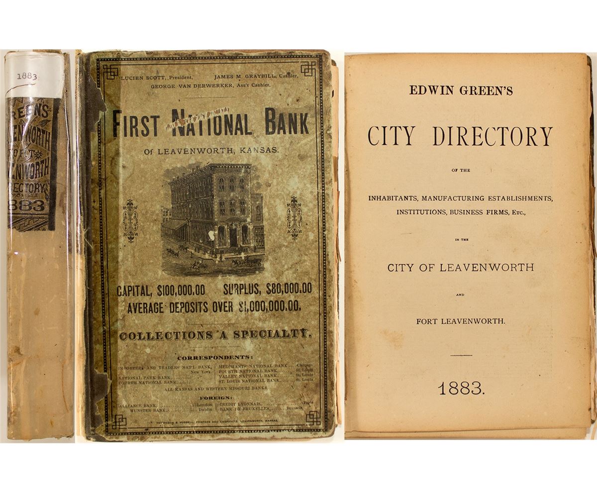 City directory of the "inhabitants, manufacturing establishments, institutions, business firms…" It is 291 pages. The publisher is not identified, but it would appear to have been produced by Green's Leavenworth. The covers are green printed boards. There is tape along the spine and the front cover is detached resulting in loose pages. The directory appears complete. Although there are listings for the 1878 and the 1884 directories in OCLC, this 1883 copy has no listings in OCLC. Rarity: [i].