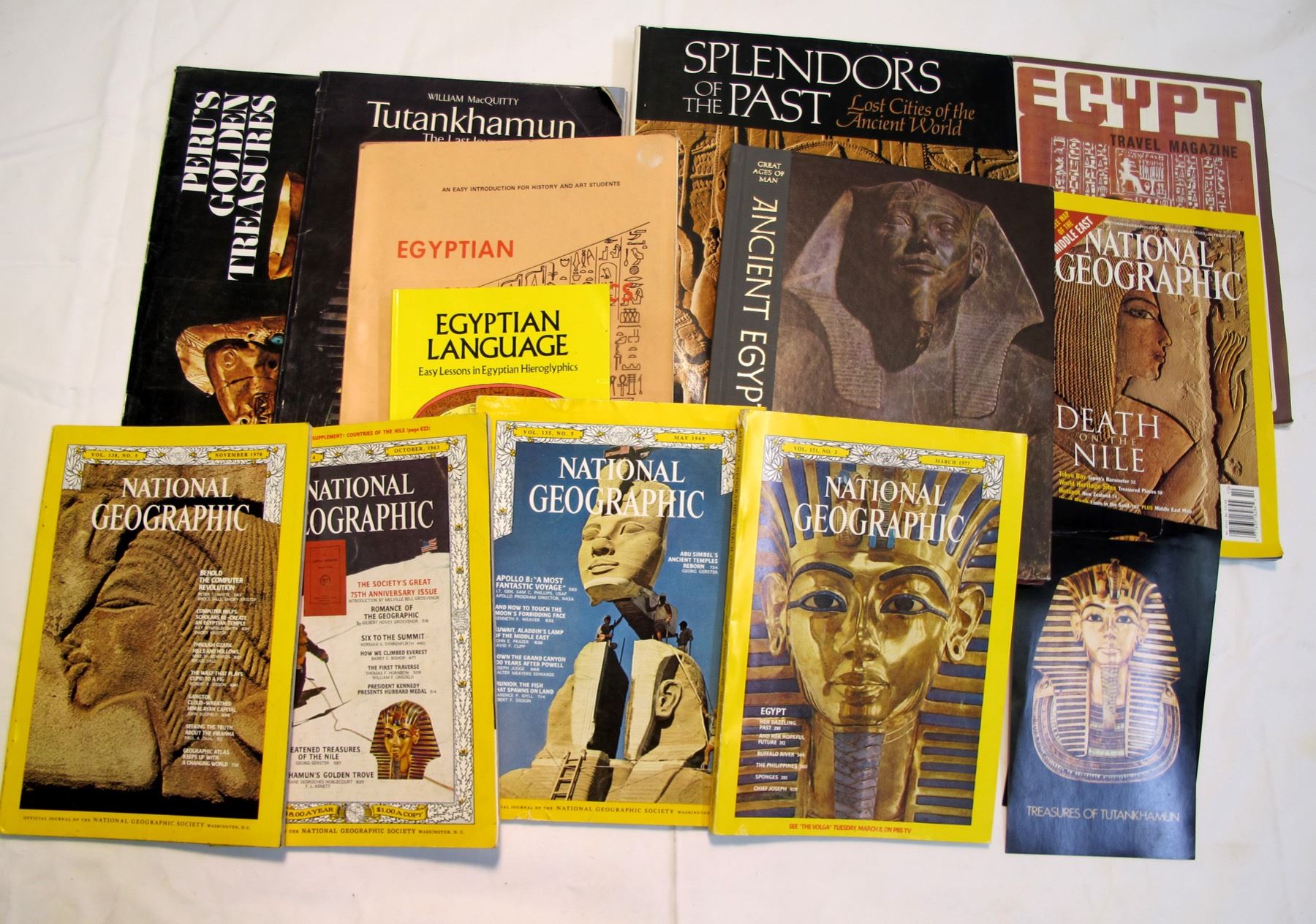 Interesting lot of National Geographic magazines, a book of Egyptian Language; Egypt Travel Magazine; Egyptian Hieroglyphics book (self-study), & more.