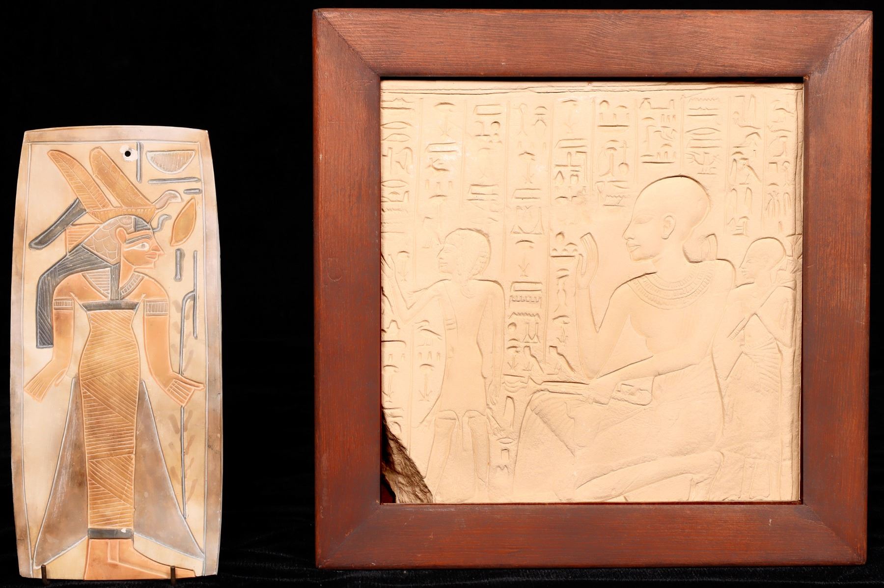 Two pieces of reproduced Egyptian hieroglyphics. One measures 4"x 9", the other is framed and 10"x 10". Please see photos for more details. Bracken Estate
