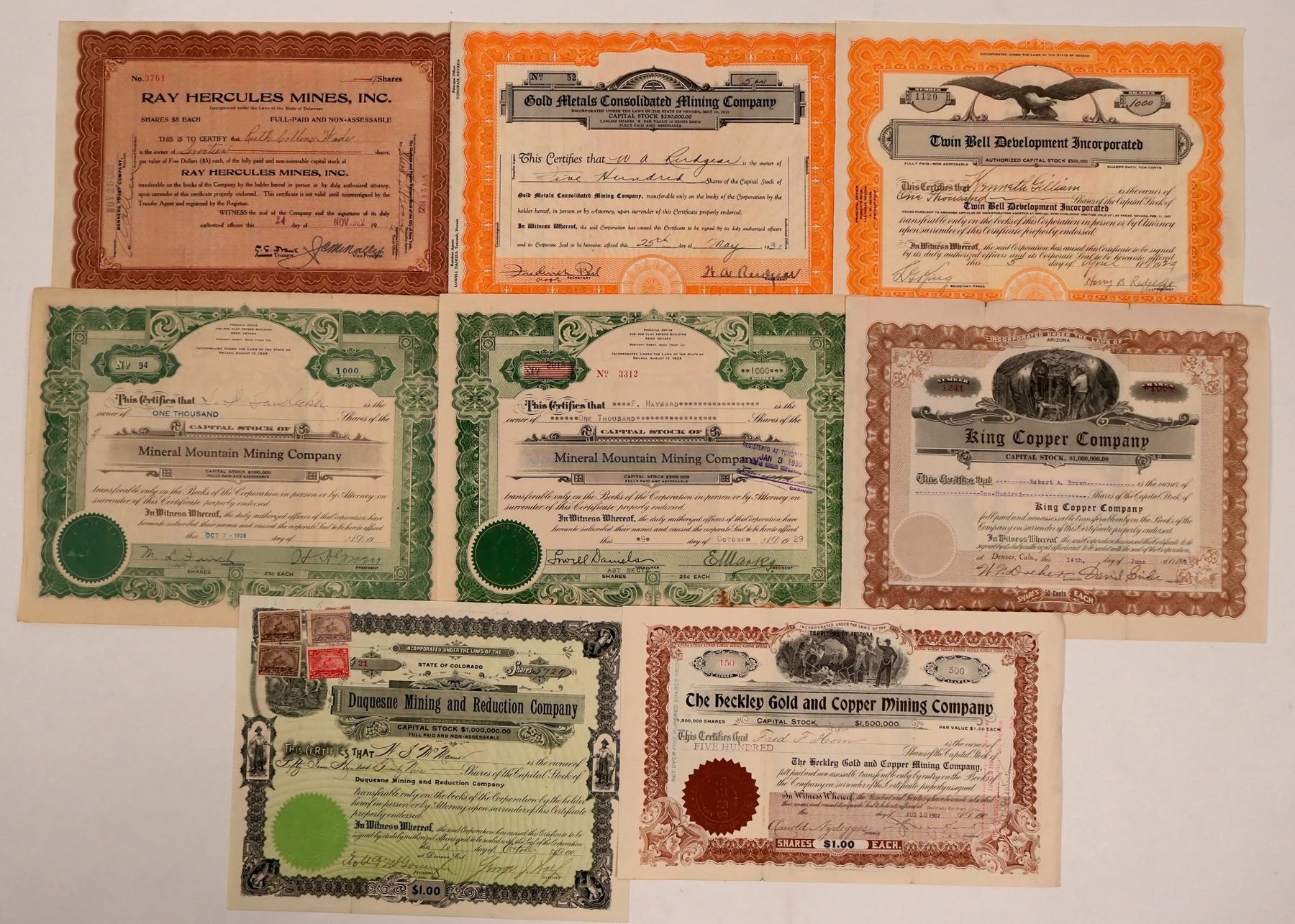 Lot of 8, most different. Included: Heckley Gold & Copper MC (Black Hawk District, Wickenburg, 1907); Duquesne Mining & Reduction Company (Santa Cruz County, 1900); King Copper Co. (Cochise County, 1918); Mineral Mountain Mining Co. (Santa Cruz County, 1926 and 1929); Twin Bell Development Inc. (Santa Cruz County, 1929); Ray Hercules Mines, Inc. (1922); and Gold Metals' Consolidated MC (Cochise County, 1931).
