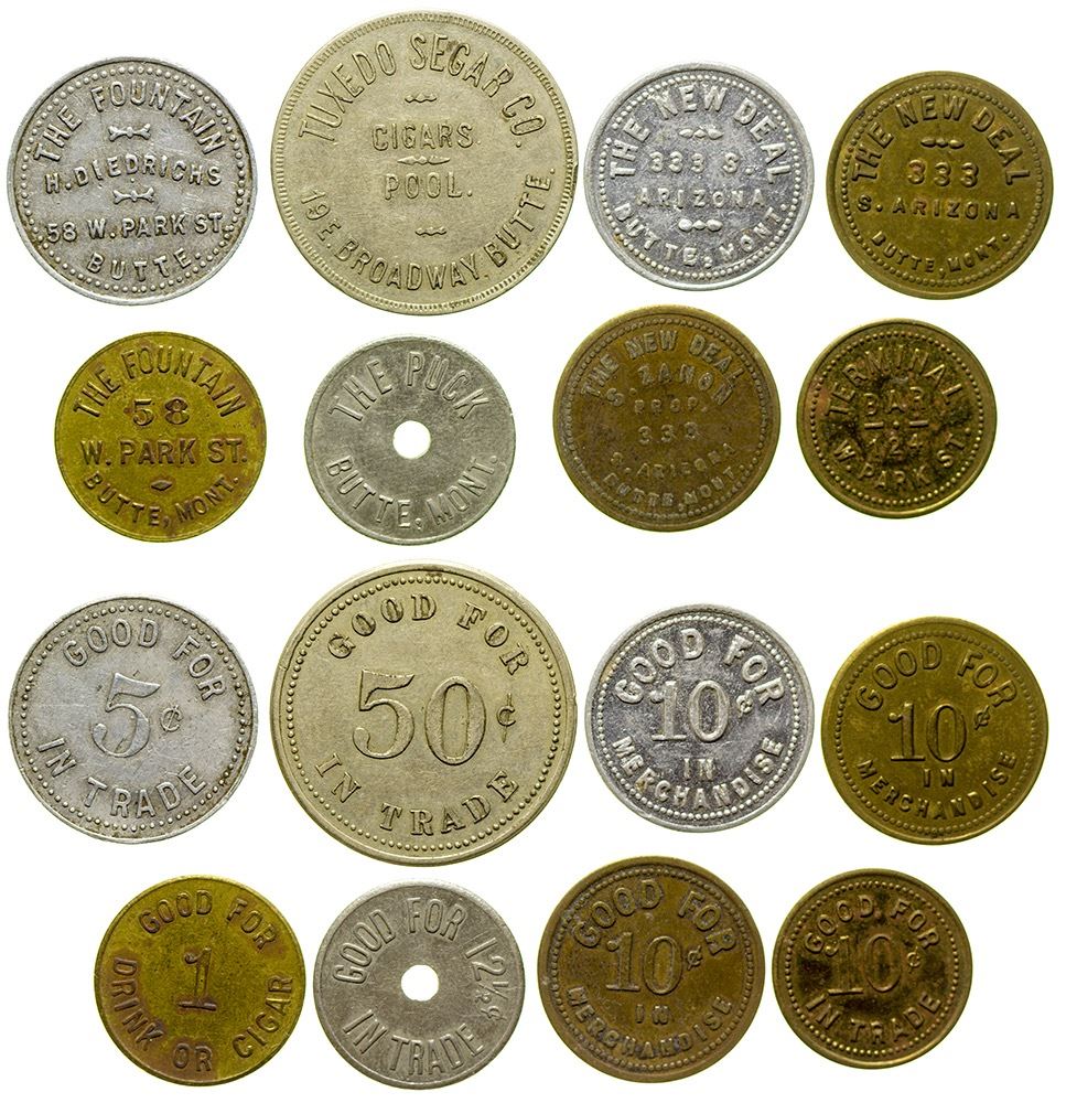 1) Three The New Deal // GF / 10c / In / Merchadise. 2) Two The Fountain // GF / 1 / Drink or Cigar. // GF 5c / IT. 3) Terminal / Bar // GF / 10c / IT. 4) Tuxedo Segar Co. // GF / 50c / IT. 5) The Puck // GF 12 1/2c / IT. (Svoboda Collection) City: Butte State: Montana Date: HWAC# 35361