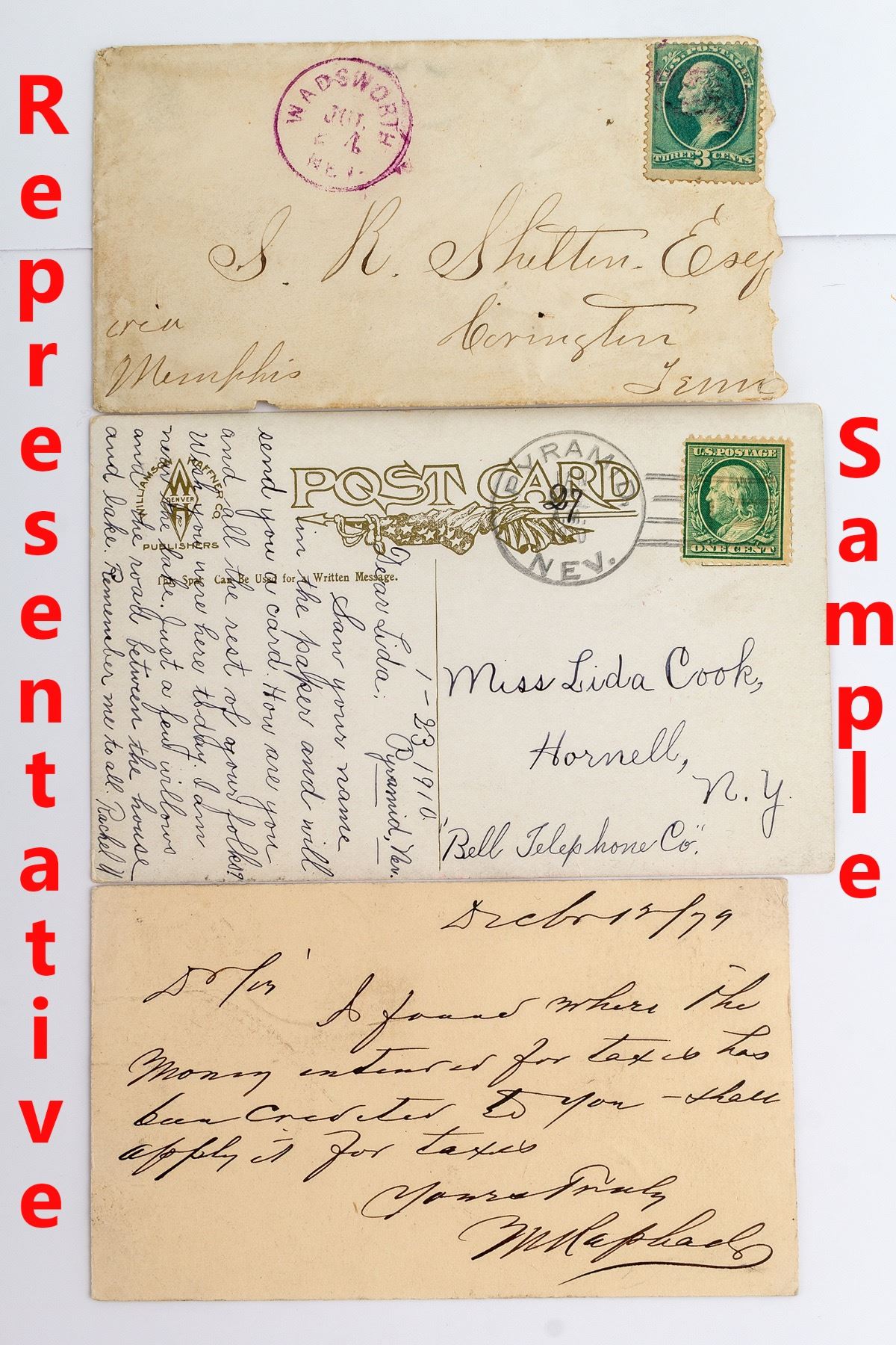 The most interesting piece is a 1911 Verdi, Nevada letter with good contents. The author is working for the Truckee River Power Canal (which still traverses right down main street). He is working in a carpenter's gang on the flume. He writes about the fire at Stone and Webster-contractors for the canal. The fire took place on May 16th.The letter was sent on May 18th. Historic background for both the canal and company are included. Also: Extremely early second period 1909 Steamboat with a very strong strike, earliest second period 1910 Pyramid with two pages of historical background on sender Rachel Updyke, two early (1879 and early 1880's) purple Wadsworth cancels, 1951 Flanigan, 1952 Pyramid, 1909 Verdi with historical background on sender WG Douglass. State: Nevada City: Washoe County HWAC#: 46498 Date: