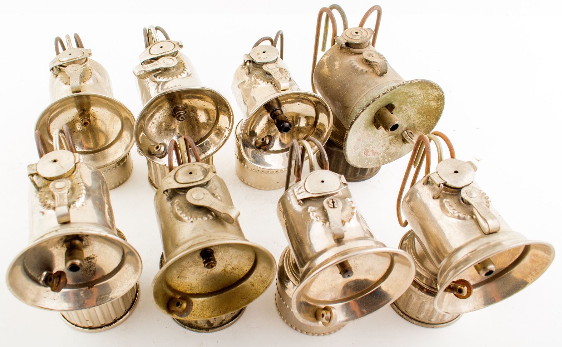 A collection of eight handheld small Justrite lamps, each of which appears to be different. All are nickel plated. They all look similar but are not. Please inspect this nice collection. State: City: HWAC#: 46363 Date: