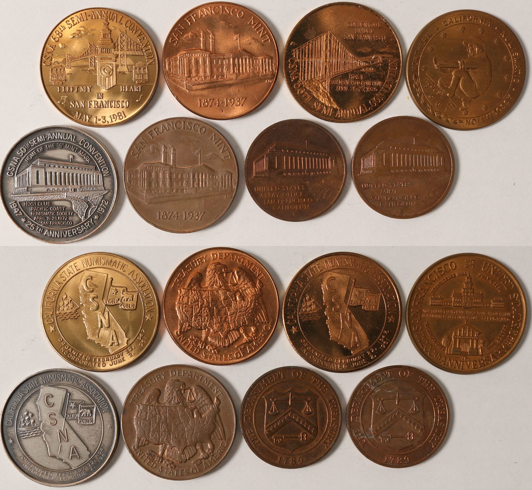 San Francisco Mint, 200 Year Anniversary, CSNA Convention, CSNA 1981 Convention, 1975 CNSA Convention, SF Mint Medal, 1937 Mint Medal, Assay Office medal.