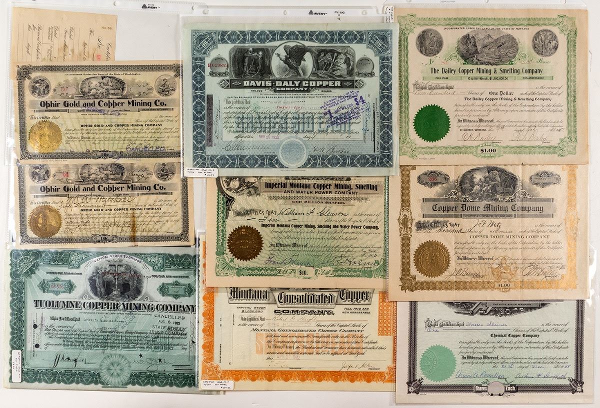 Eight stocks: Ophir Gold and Copper Mining Co., no. 94. 50,000 shares, M. A. Mitchell, president, issued to self, 1904; Dailey Copper Mining & Smelting Co., no. 285, 200 shares, 1912; Imperial Montana Copper Mining, Smelting Co., no.1084, 10 shares, 1902; Copper Dome Mining Co., no. 233, 1000 shares, 1907; Tuolumne Copper Mining Co., no. A6506, 10 shares, 1922, punch cancelled; and more. City: State: Montana Date: ID: 36222