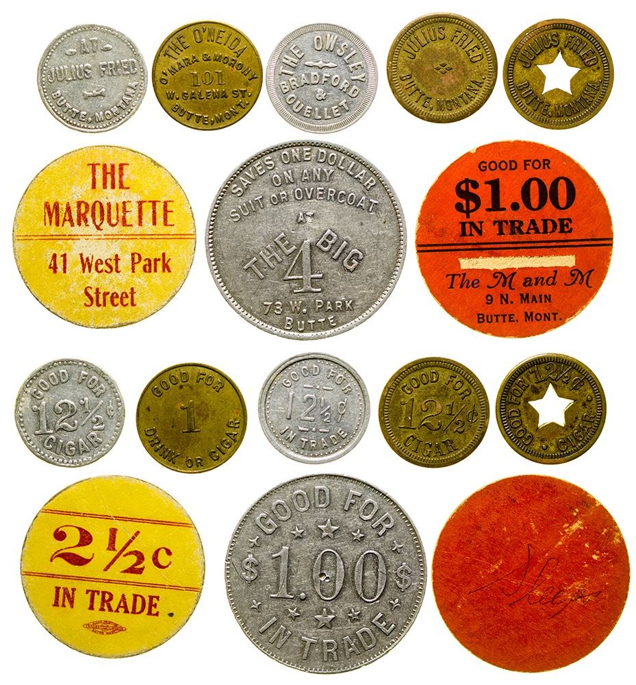 1-3) Three tokens: Julius Fried // GF 12-1/2c / IT, round, brass. Julius Fried // GF / 12-1/2c / Cigar, round, aluminum. Julius Fried // GF / 12-1/2c / Cigar, round, brass, 5-point star center cut-out. 4) The Oneida // GF / 1 / Drink or Cigar. 5) The Owsley // GF / 12-1/2c / IT. 6) The Big 4 // GF / $1.00 / IT. 7) The M and M // GF / $1.00 / IT. 8) The Marquette // GF / 2-1/2c / IT. (Svoboda Collection) City: Butte State: Montana Date: HWAC# 35378