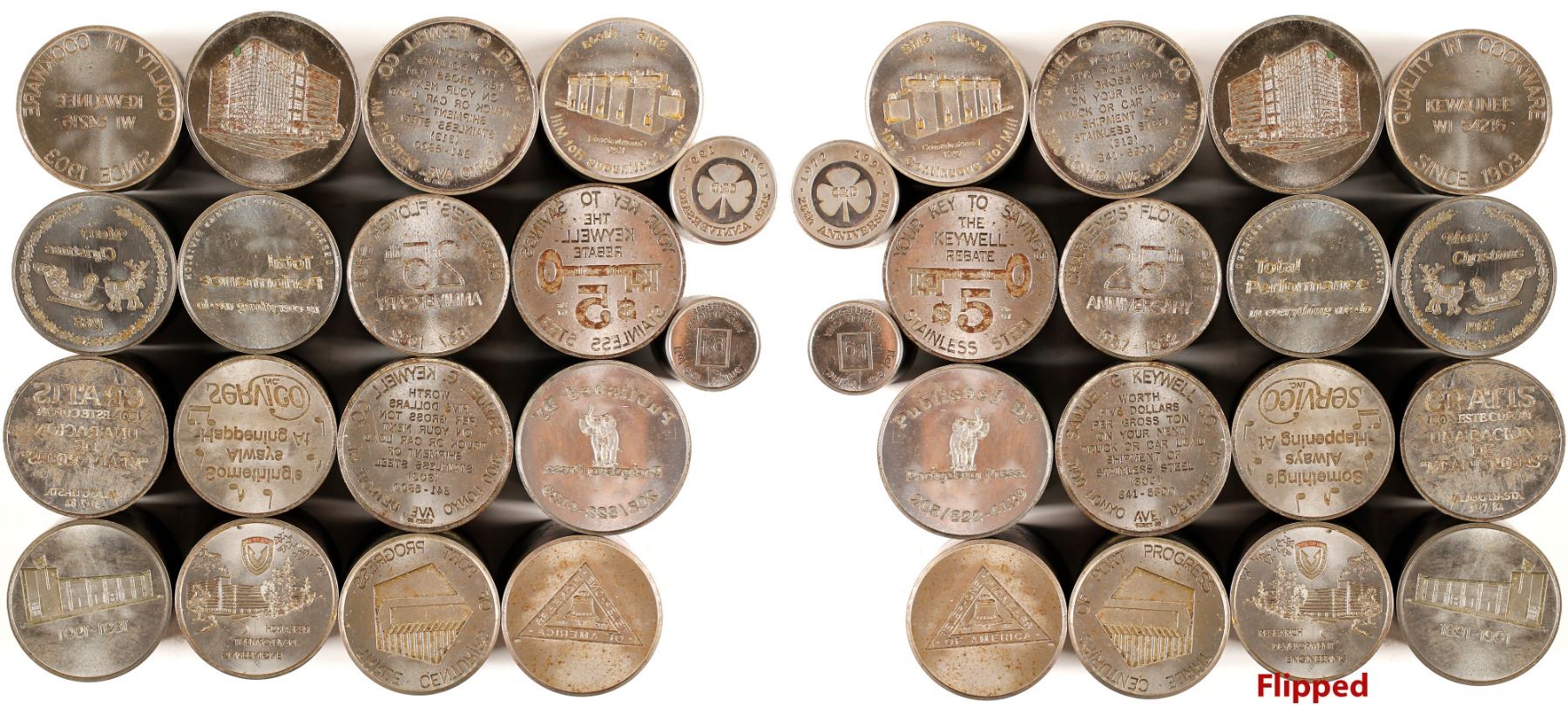 "Your key to savings;" The Keywell Rebate, $5 stainless steel. 100" continuous hot mill, Alcoa. "Total performance in everything we do." Three centuries of port progress. Quality in Cookware, Kewaunee WI, Since 1903. Telephone pioneers of America, 1911-1973. NWT Mint Historical Die Collection.
