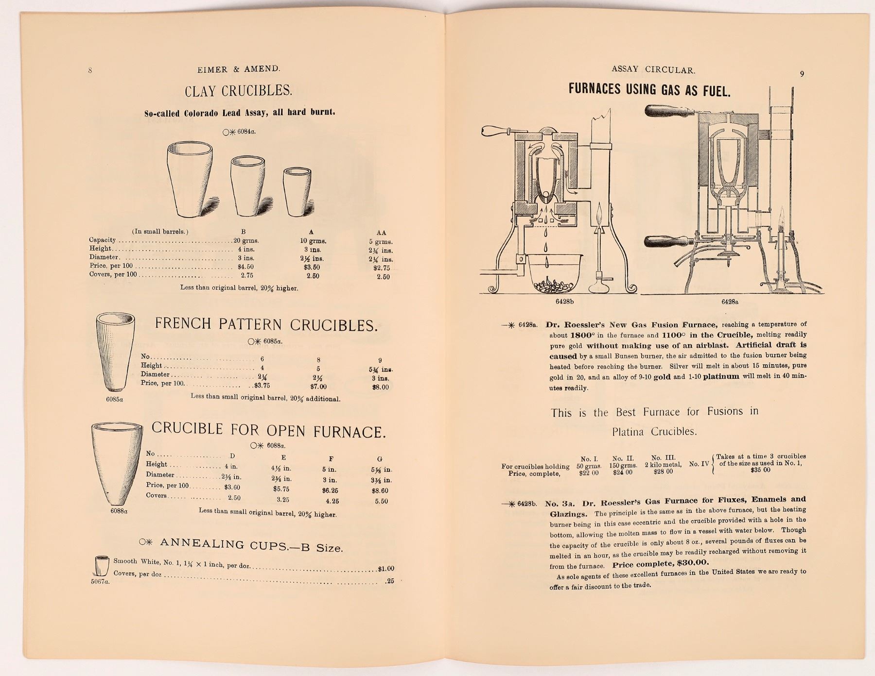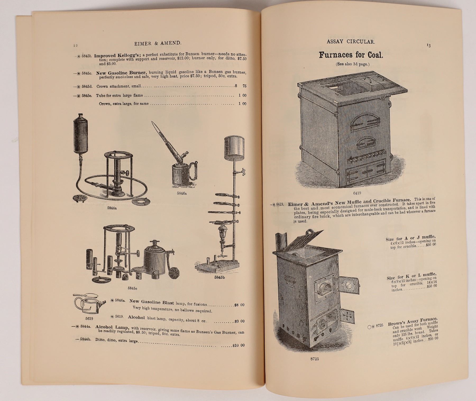 "Assay Circular, Comprising the Most Necessary and Most Modern Apparatus for Fire and Chemical Assay." Eimer & Amend, Manufacturers and Importers of Acids, Chemicals, Chemical Apparatus, Balances, Etc. 205, 207, 209, 211 Third Avenue, New York. 16pp. with numerous illustrations of assay equipment for sale including balances, crucibles, furnaces, ore crusher, and more. 10 x 6.5" Founded by Bernard G. Amend in 1851. Later Carl (Charles) Eimer a school friend from Germany joined him. The firm was an important importer of European laboratory supplies, reagents, scales and custom glassware. The firm furnished equipment to Thomas Edison, E. R. Squibb, Charles Steinmetz, Henry Ford and many other American manufacturers. Bernard Amend was later involved in the establishment of the American Chemical Society. New York New York Franklin Collection