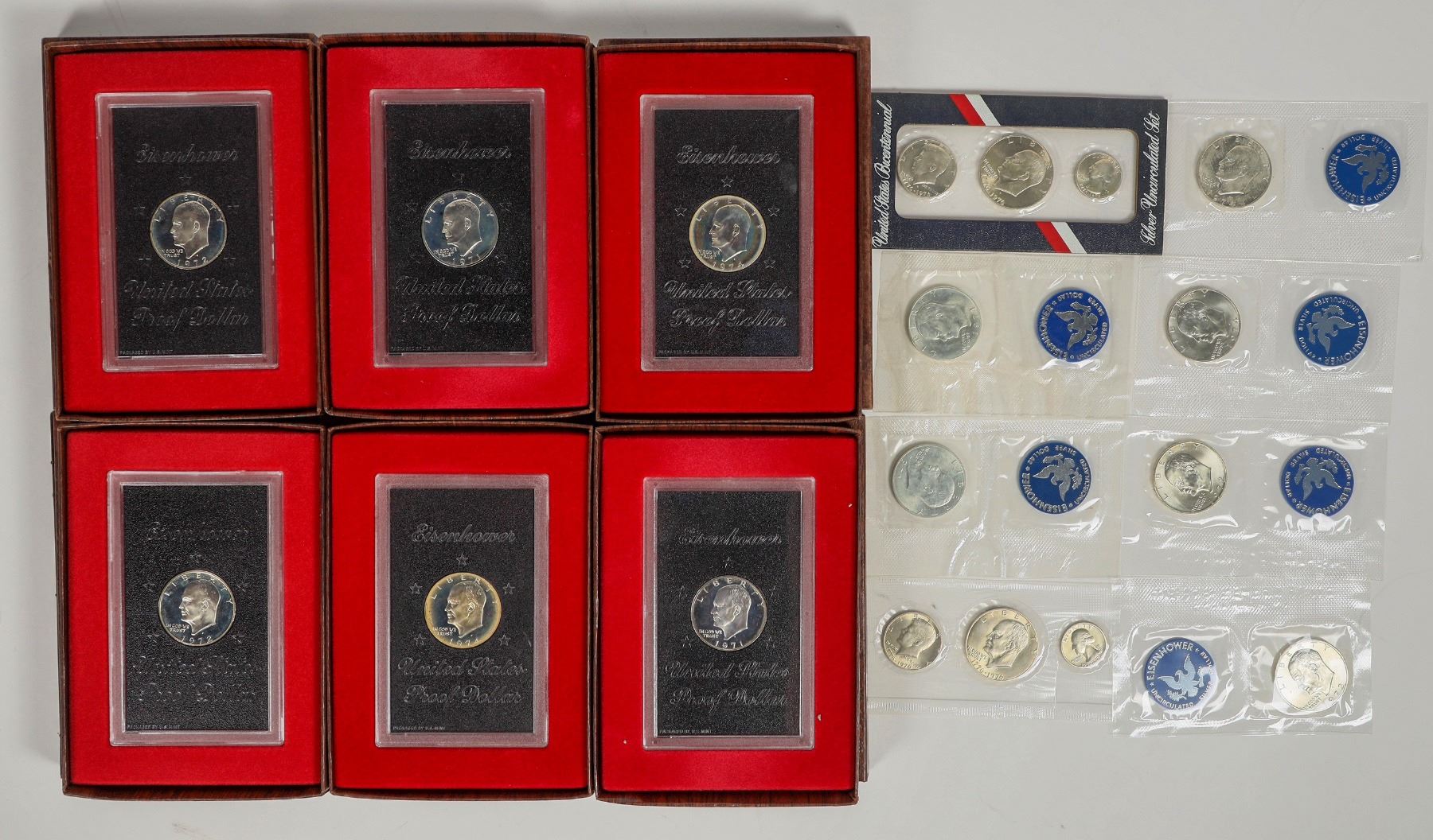 Fourteen Eisenhower dollars in original mint packaging. Six brown box proofs: 1971 (2); 1972 (2); 1974 (2). Uncirculated blue envelopes: 1971 (2); 1972 (2); 1974 (2). Bicentennial red envelope three coin sets 1976 (2).