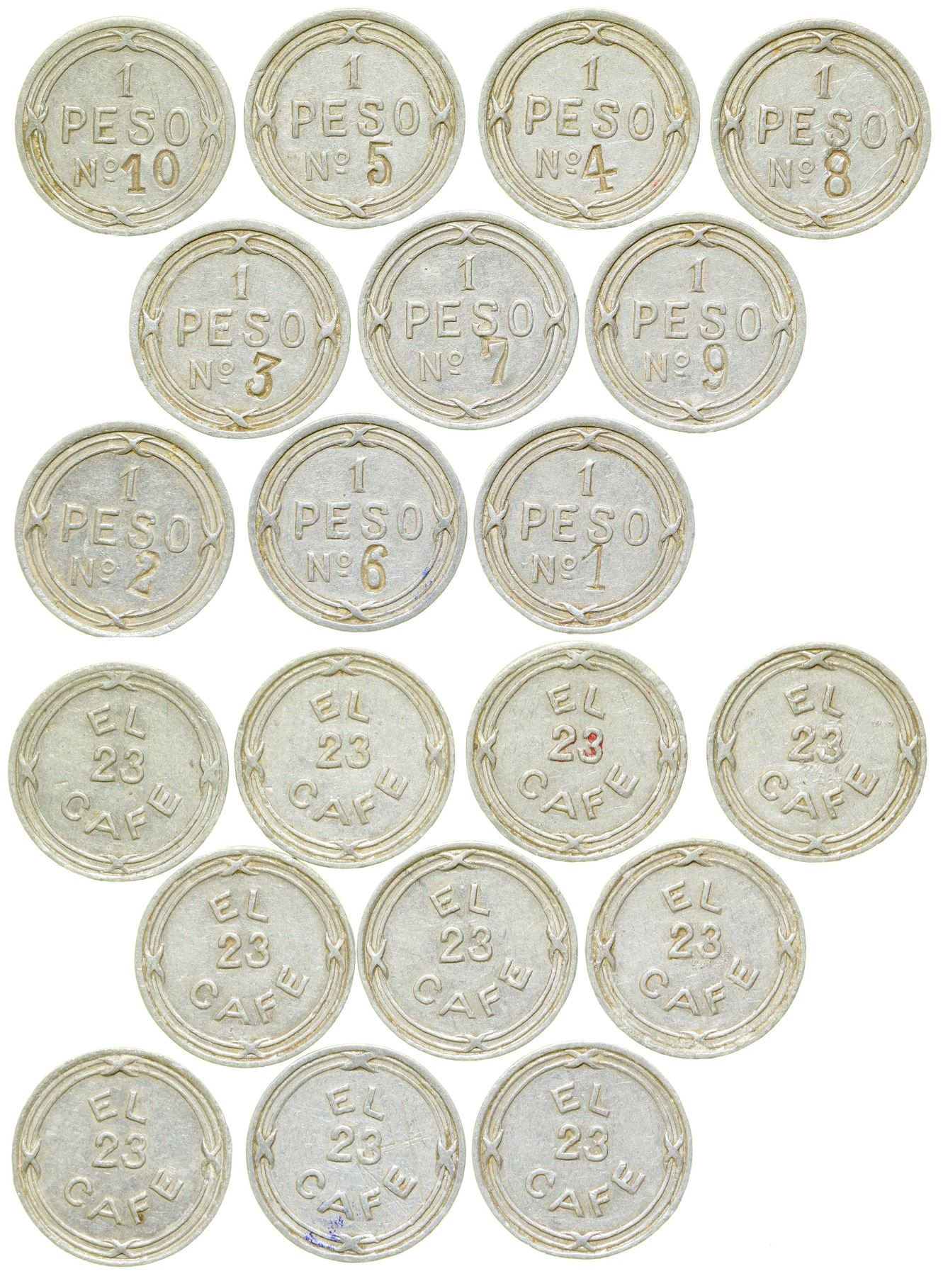 Lot of ten (complete set) tokens from Villa Mercedes in San Luis Province. Obv.: El / 23 /Cafe; Rev.: 1 / Peso / #1 through 10. Wm, rd., 20 mm. These are more rare than Rosario.