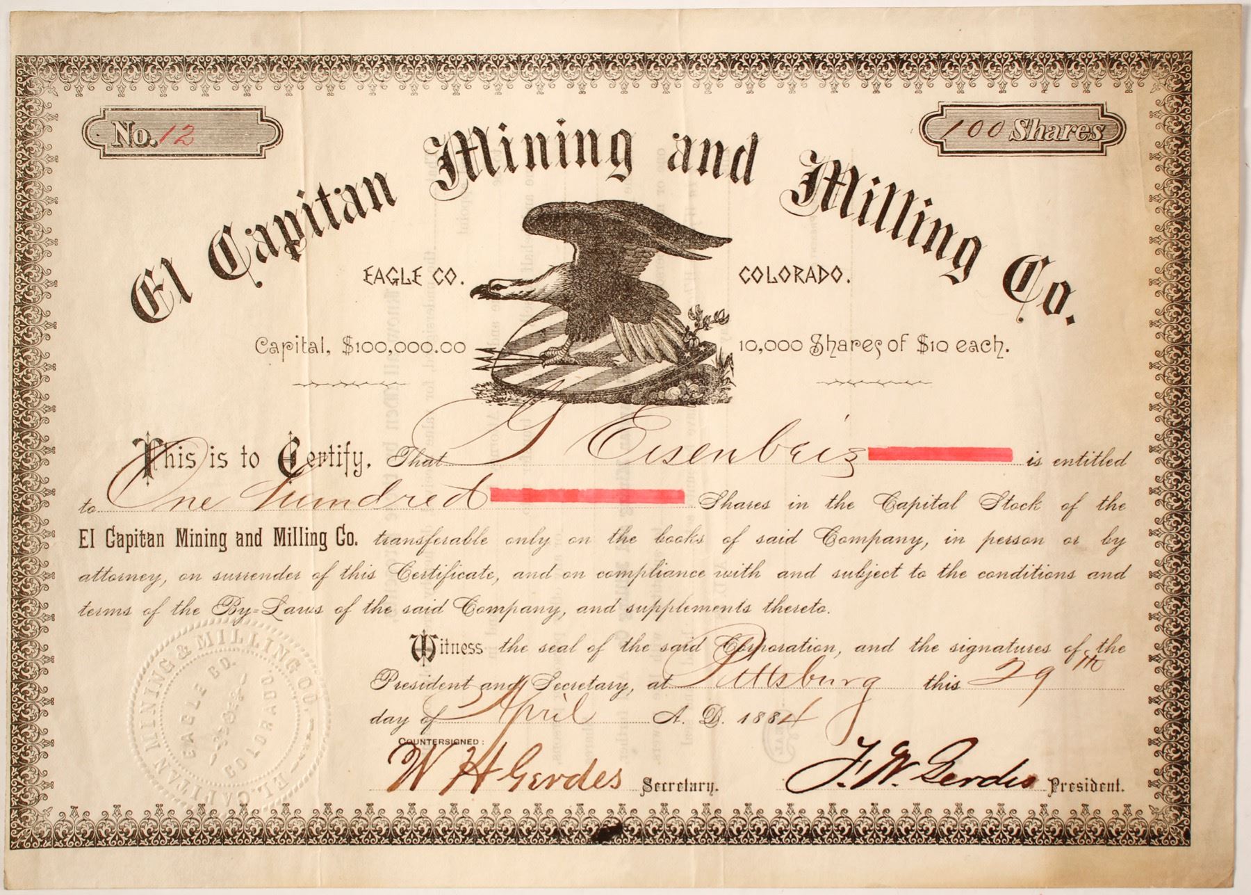 Tennessee Pass District. Early # 12 for 100 shares to Eisenbeiz. Signed by WH Gerdes and president FW Gerdes. Dateline Pittsburg 1884. Eagle Vignette. No printer. Not cancelled. Cut close at left. No edge or corner issues. Light toning on right. Prag Collection State: Colorado City: Eagle County Date: 1885 HWAC# 85211