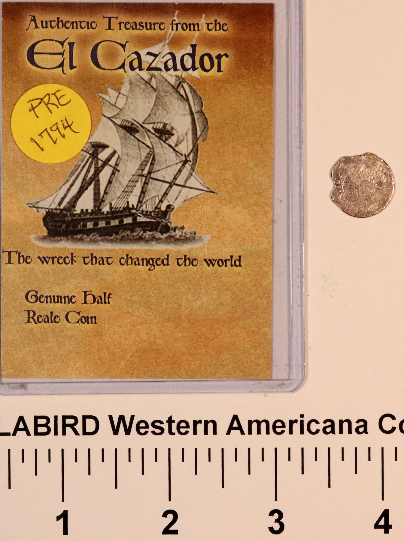 Authentic Treasure from the El Cazador which sank in 1784, this 1/2 reale comes with a card of authenticity with the story of the historic shipwreck on the reverse.