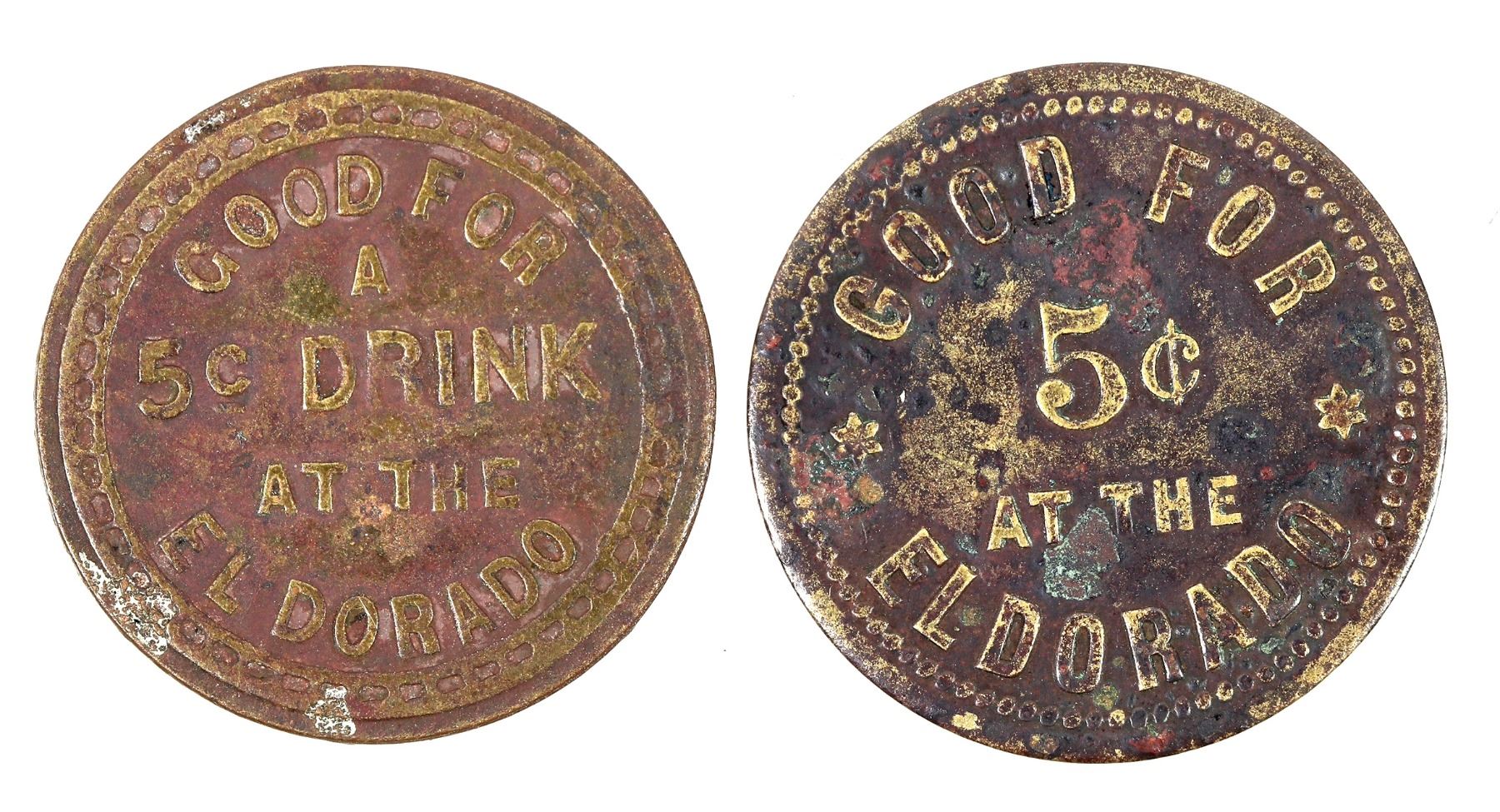 Two tokens from San Francisco: 1) P.C. CO-OPERATIVE / CIGAR / M'F'G. CO. / S.F. / CHECK // GOOD FOR / A / 5c DRINK / AT THE / EL DORADO; Br., rd., 24 mm; (The Pacific Coast Co-Operative Cigar Manufacturing Company was incorporated in June 1886.) 2) The Brunswick Balke / Collender / Compy. / (pool table) / Check // Good For / 5c / At The / El Dorado; Br., rd, 24 mm. (unlisted at tokencatalog.com).