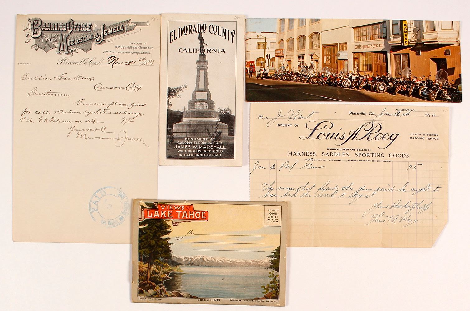 Lot of 6. 1) Rare 1883 Knights Templar ribbon for El Dorado Commandery No. 4, Placerville for the event in San Francisco August 1883. Compliments of Guiseppe Rolleri. Gilt and black writing and vignettes of bear, Sutter Mill, and crossed swords. 8 x 2.5" Small stains. Rolleri died in San Francisco August 24, 1883 and is buried in Placerville Union Cemetery. He was a treasurer for the organization. 2) El Dorado County promotional booklet (6" x 3.25") printed by News Print in Sacramento for the PPIE in San Francisco in 1915. Approx. 20 pages with B&W photos incl. fold-out Tahoe panorama. 3) c.1920 Lake Tahoe souvenir accordion-style book of 22 color views. 4) Rare letterhead for the Banking Office of Mierson & Jewell, Placerville, 1889, to B&E Bank in Carson City re: stocks. 5) 1916 Placerville billhead for Louis A. Reeg, Harness, Saddles, & Sporting Goods. 6) Plus one panoramic photo postcard of Ramrod in San Francisco. (Prag Collection) Date: Location: El Dorado County, California HWAC # 54690