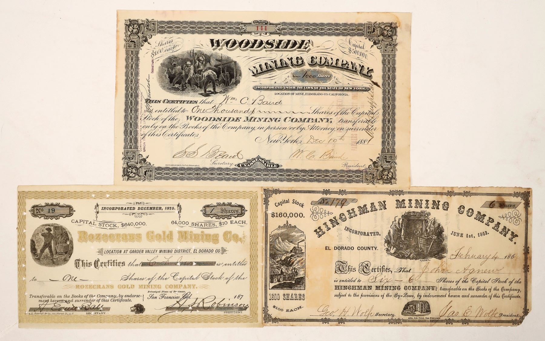 A group of three stock certificates from mining companies based in El Dorado County, California, dating from 1864 to 1881. El Dorado County is perhaps America's most significant mining site; the discovery of gold there in 1848 sparked the California Gold Rush, propelling California to statehood and massively impacting the economy of the United States. The issuing companies are the Hinchman Mining Company, Bozecrans Gold Mining Co., and Woodside Mining Company. All three are signed by the secretary and president of their respective companies; the Bozecrans and Woodside certificate also bear embossed company seals. All three have engraved vignettes of mining scenes. Generally good condition with some wear and staining around edges of certificates.