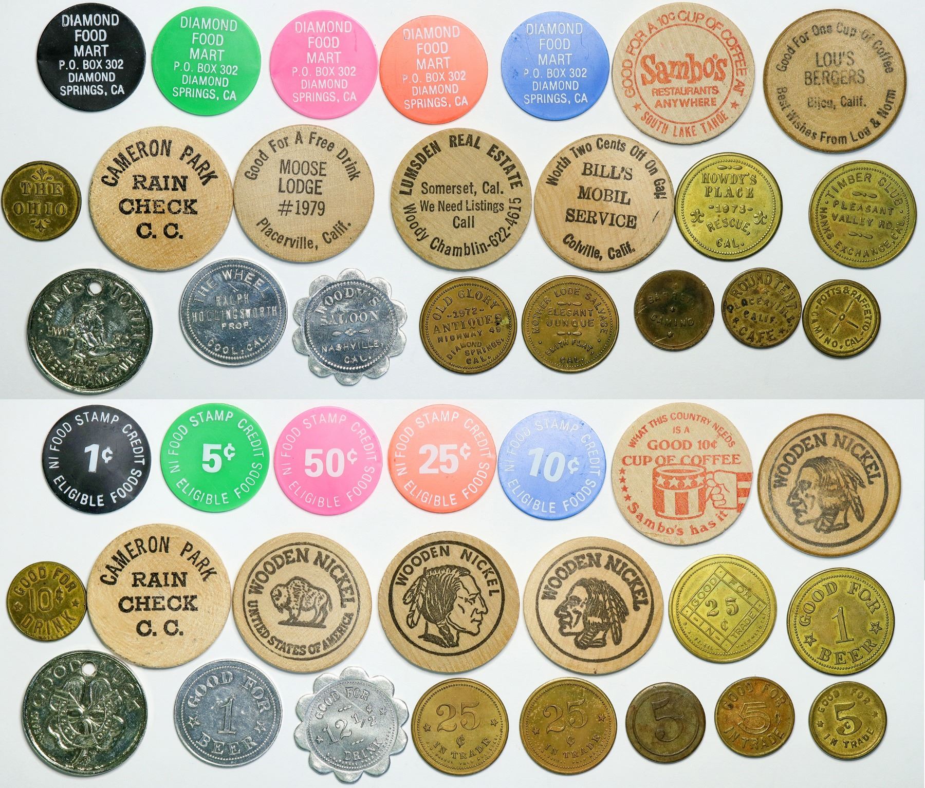 22 pieces. 11 metal tokens:The Ohio GF one drink, Pott's & Rafetto Camino, Ca GF 5c, Round Tent Cafe Placerville GF 5c,Woody's Saloon Nashville Ca GF 12 1/2 c, Mother Lode Savage Smith Flat GF25c, The Wheel Cool, Ca GF 1 beer, Howdy's Place Rescue Ca. GF 25c pkus two more. 5 Plastic: Diamond Food Mart Diamond Springs GF 1.5.10.25.and 50c Food Stamp credit. Wood: Lou Berger's Bijou Ca. GF cup coffee, Bill's Mobile Service Colville GF 2c off gal. Moose Lodge #1979 Placerville GF free drink plus three more.