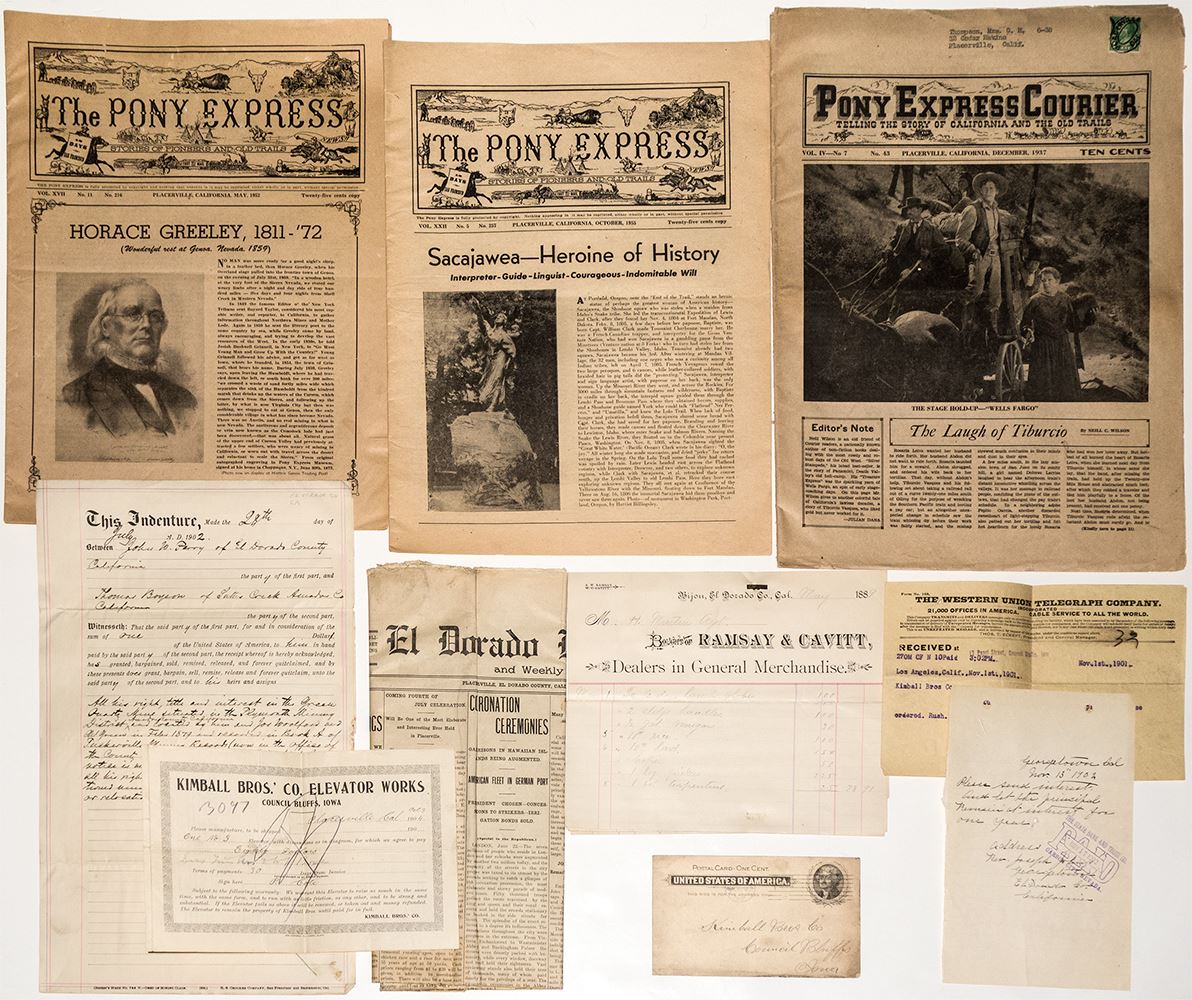 1889 receipt from Ramsay & Cavitt, Bijou, El Dorado Co.; 1911 issue of the El Dorado Republican; 1902 indenture contract; 1902 letter from Georgetown; 1937, 1952 and 1955 issues of the Pony Express "stories of pioneers and old trails."