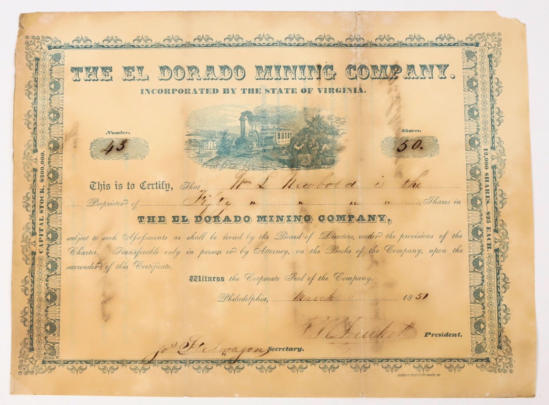 Inc. in Virginia. No. 43, issued for 50 shares to William Newbold in 1851 in Philadelphia. Signed by the president and secretary. Not cancelled. Locomotive and mining vignette. Deep folds, heavy toning/soiling. See photo. This company operated the Shaw Mine three miles northwest of the town of Mud Springs (later El Dorado), El Dorado County, California. Extremely rare.