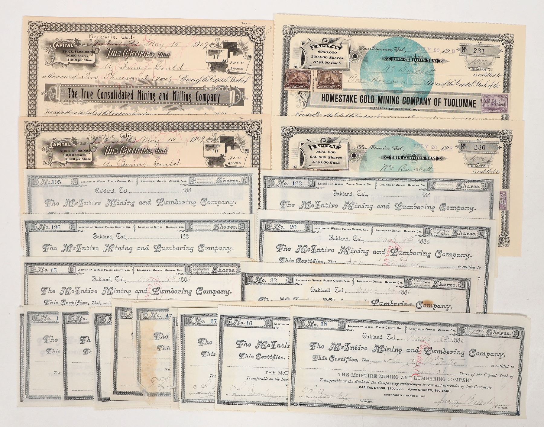 A collection of mining stocks from three companies based in El Dorado or Placer County: McIntire Mining and Lumbering Co. (20), Homestake Gold Mining Co. of Tuolumne (2), and True Consolidated Mining and Milling Co. (2). 11 McIntire stocks are unissued. All issued stocks are signed by the company's secretary and president with embossed company seals. All True Consolidated and issued McIntire stocks are cancelled with handwritten cancellations. Rev. stamps on Homestake stocks. Good condition.