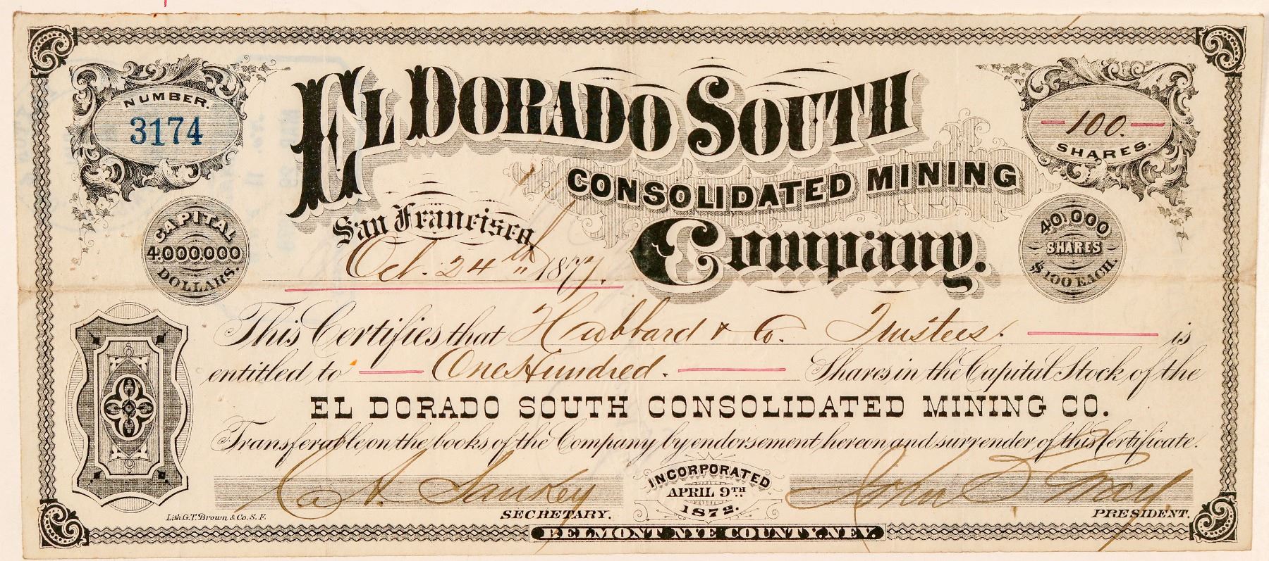 Belmont, Nye County, Nev (printed at bottom center). Inc. 1872. No. 3174, issued for 100 shares to Hubbard & Co. on Oct. 24th, 1877. Signed by president John Gray and secretary Sankey. Not cancelled. Black border and print, fancy company logo. Printed by noted African-American lithographer G.T. Brown. Pinholes, deep folds. 4 x 9" Located 2.5 miles from Belmont, adjacent to the El Dorado North. They have good hoisting works, a 20 stamp mill, and other works. Their mine and milling cost is $20 per ton. Over $300,000 has been taken out. [Ref: Annual Mining Review & Stock Ledger, 1876, pg. 46] Ken Prag Collection