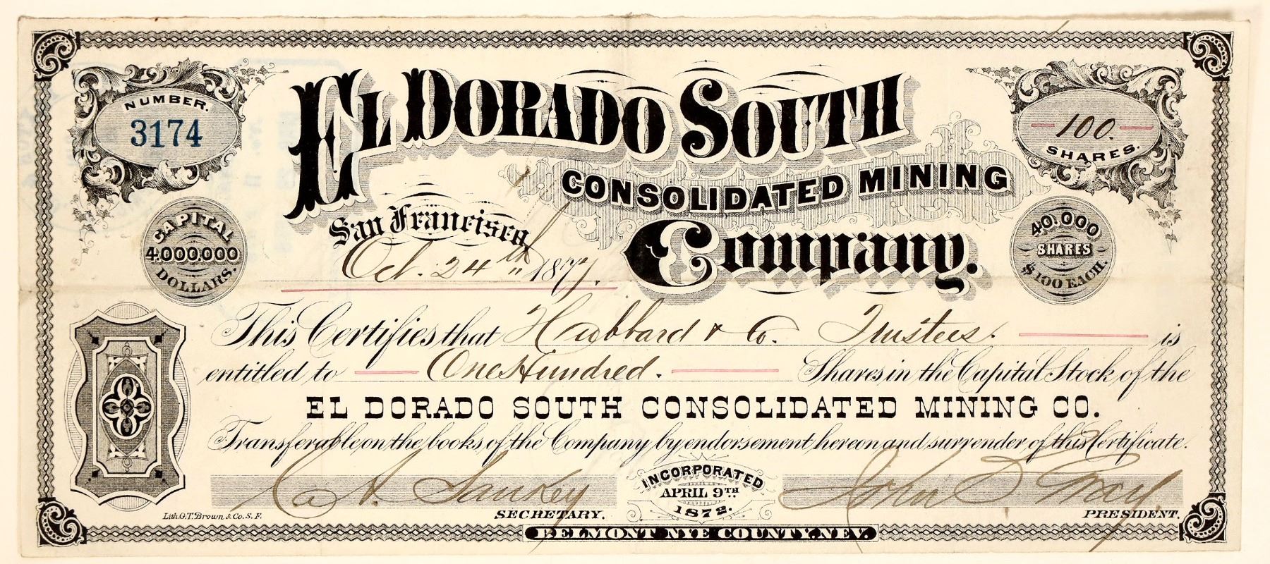 A stock certificate for 100 shares in the El Dorado South Consolidated Mining Company of Belmont, Nevada, dating from 1877. The certificate is made out to Hubbard and Co. Trustees, and is signed by both the president and secretary of the company. No. 3174 issued. Uncancelled. Belmont was a mining town in Nye County, Nevada, founded in the 1860s after the discovery of silver in the area. After the mines were exhausted in the 1880s, the town slowly declined, eventually becoming a ghost town in the early 1900s.