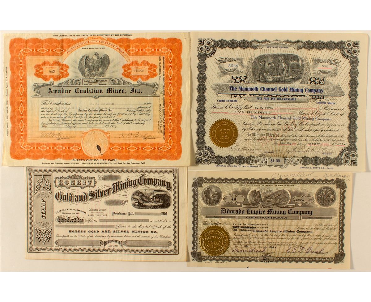 Lot of 4: El Dorado Empire Mining Co. (cancelled) rom 1935. The Mammoth Channel Gold Mining Co. (uncancelled) from 1911. Amador Coalition Mines, Inc. (uncancelled) from 1929, with assessment stamp on reverse. Finally, a Civil War vintage c1860's "Honest Gold and Silver Mining Co. document, unissued, in pristine condition. All others have ornate border, gold seals and beautiful vignettes, lithos by Goes. All are in very good to excellent condition. Date c1911-1935 , CA hwac 20344
