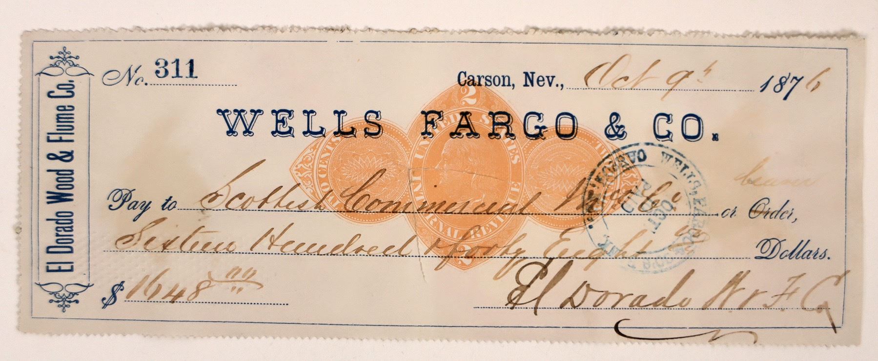 Rare. Wells Fargo Carson City check issued in 1876 to the Scottish Commercial Co. RN-G imprinted revenue. Adhesive residue in two spots on reverse. Cut cancel. Please see photos. The El Dorado Wood and Flume Company was incorporated in Nevada in 1875 with H. M. Yerington, J. W. Haynie and A. J. Ralston as trustees; H. M. Yerington was the president when the company incorporated. Its major areas of operation were in Lake Valley (Tahoe), El Dorado County, California and in Hope Valley, Alpine County, California. The company also held land in Ormsby, Douglas, and Washoe counties, Nevada. The flume came into the valley at Brown's Station and Washoe City. Both of these locations were on the V&T Railroad. Served the insatiable lumber needs of the Comstock mines!
