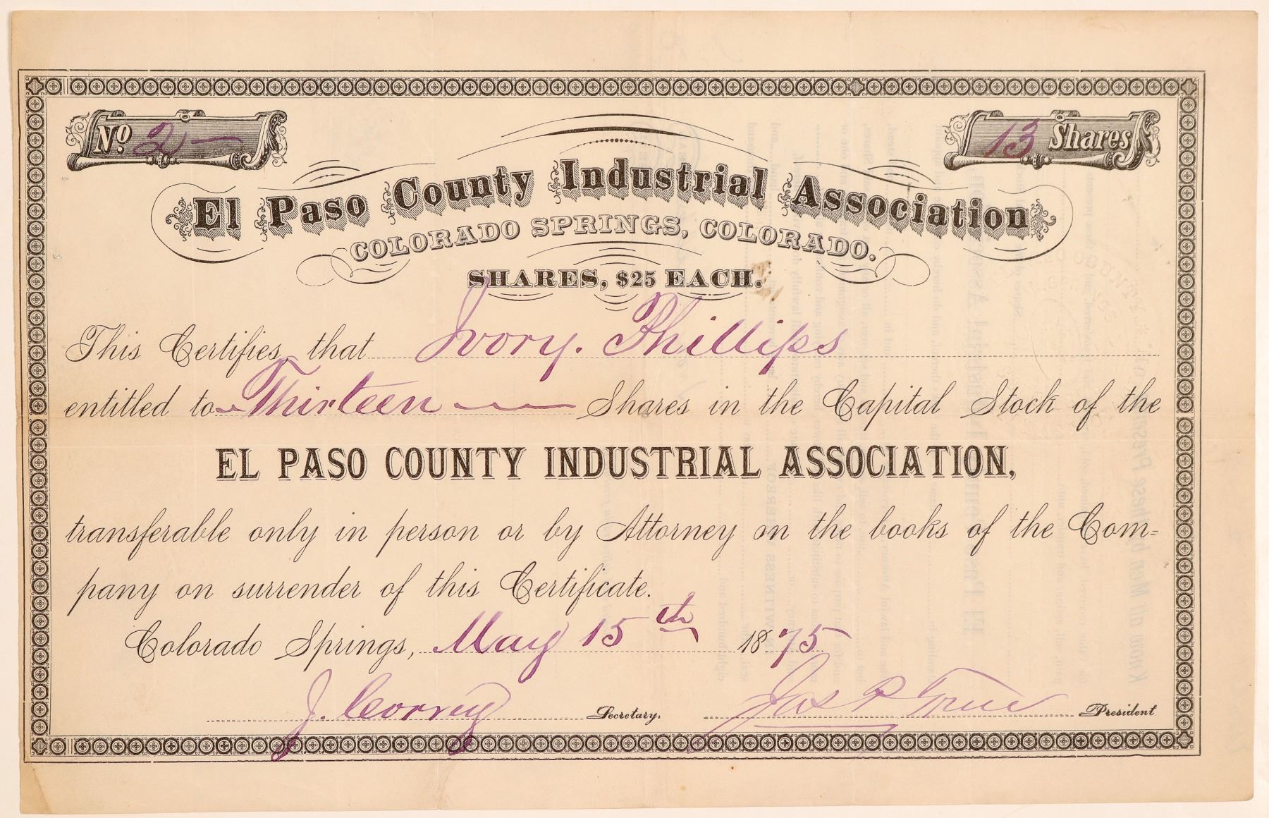 Stock Certificate from the El Paso County Industrial Assoc. Certificate number 2 Issued in 1875 to Ivory Phillips. Signed by Jas P True, and J. Corrig. Size 3.75 by 37.5 inches. Issued. Black border with "t". They held annual fares from 1874 until at least 1887.
