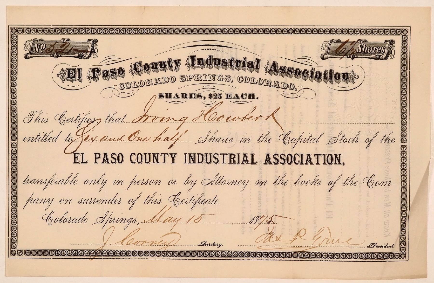 Number 52 for 6 1/2 shares to Irving Howland. Signed by Correy and True. No edge, color, discoloration issues. Held their first annual fair in 1874.