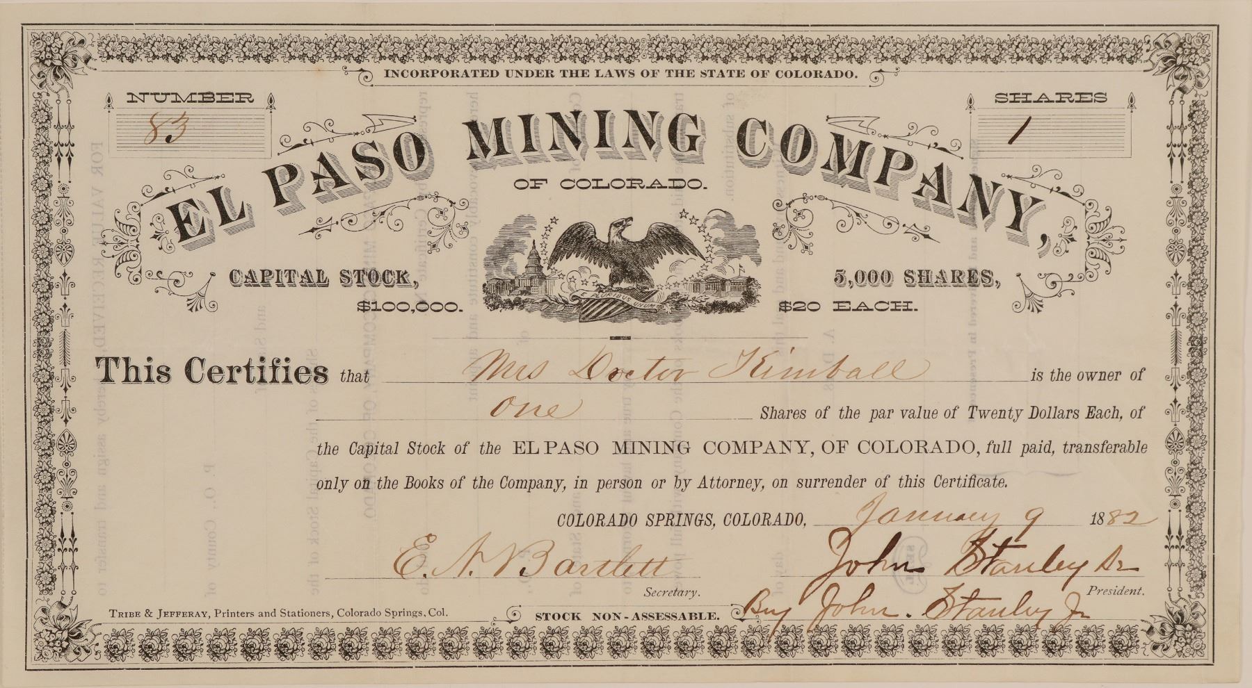 Inc. in Colorado. No. 83, issued for one share to Mrs. Kimball on January 9th, 1882 in Colorado Springs. Signed by president John Stanley and secretary E. Bartlett. Not cancelled. Ornate black border and print. Vignette of eagle on patriotic shield. Printed by Tribe & Jefferay, Colorado Springs. Horizontal and vertical folds. Very fine. 5.25 x 9.75" Owned the Connie Bell Tunnel site and Lady Harvard lode on Bartlett Mountain, Ten-mile district. Located in 1877. Tunnel is 420 ft. long. [Ref: Corregan & Lingane, 1883, pg. 778] State: Colorado City: Summit County Date: 1882