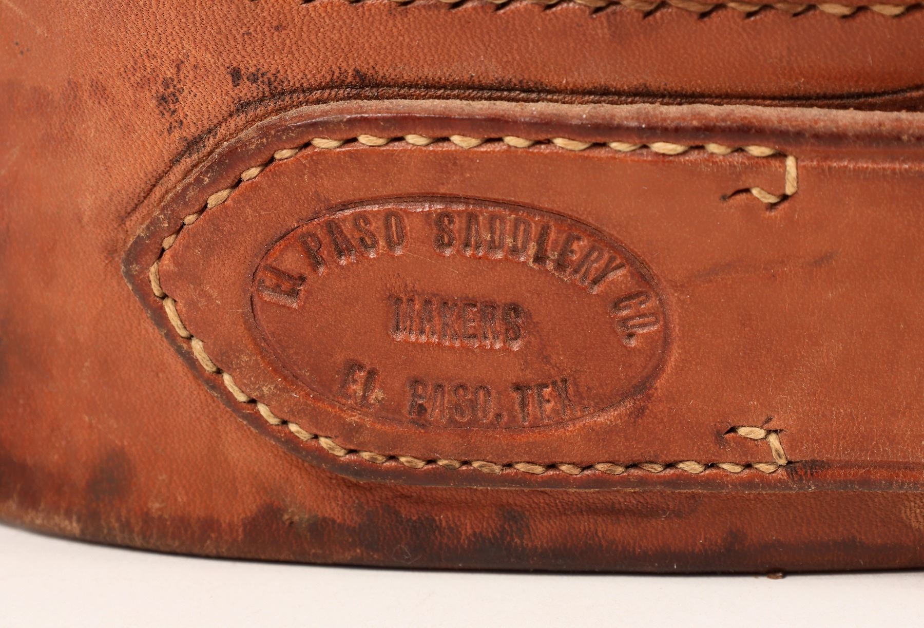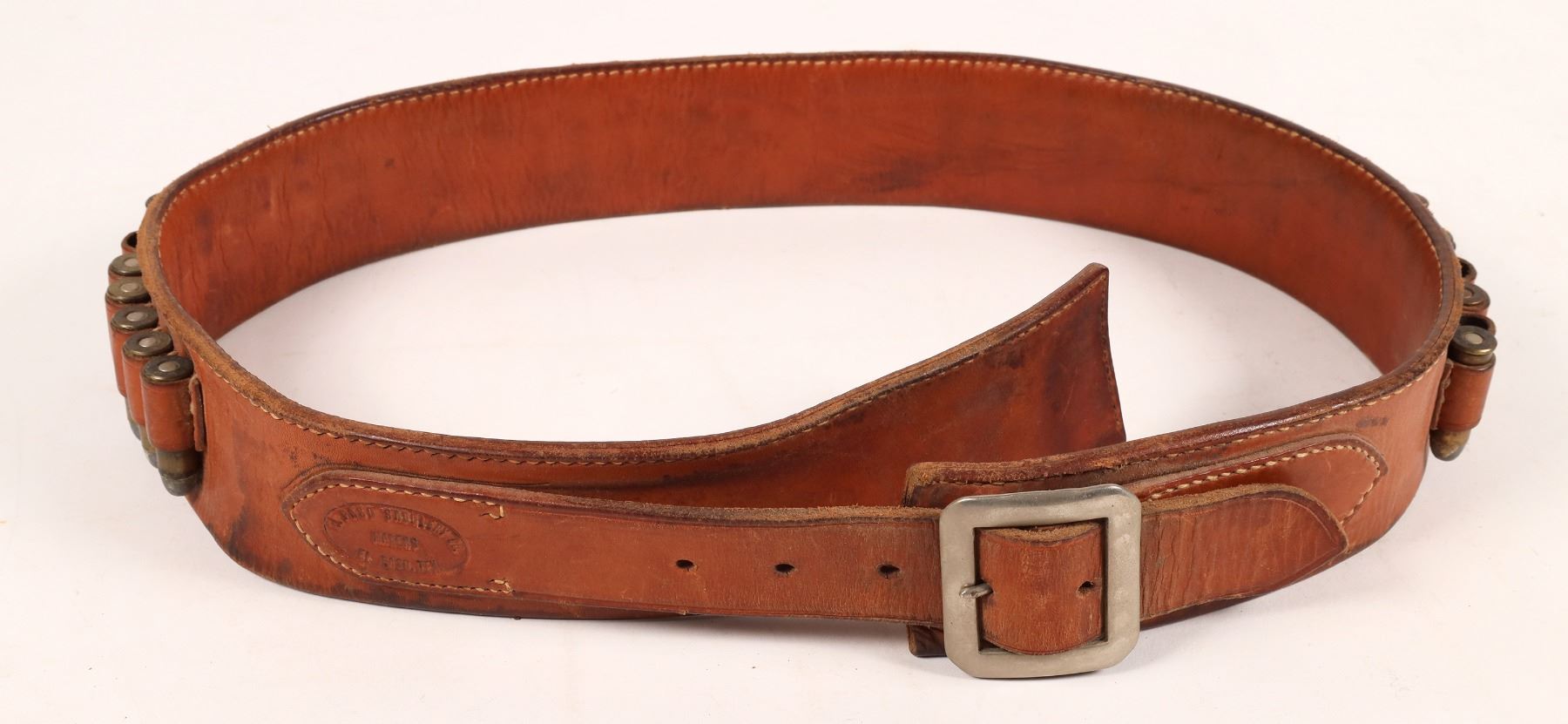 This is an El Paso Saddlery gun belt. Size 39-40 in. It is not date stamped; however, this construction of this belt is spectacular considering that El Paso Saddlery has been in business since 1889. The belt is folded over to be smooth on both surfaces with light wear. The ammunition is 31 rounds of .44-40 cal. Some rounds are marked 44-40 Winchester, 44-40 W-W, some brass construction without any markings at all, some are copper cased, some are original factory primed, still others are hand loaded with a Winchester hand press; you can tell by the indent on the primer when hand seated. This is the chronology in bullet technology in the last one hundred years. All rounds appear to be loaded with black powder with varying degrees of veritas on the cases and bullet tip. These rounds should not be shot but recognized for the evolution of cartridge development. No sales to New York, New Jersey, California, Alaska, and Hawaii. No international sales. Extra shipping charges apply. From the Sherman collection.