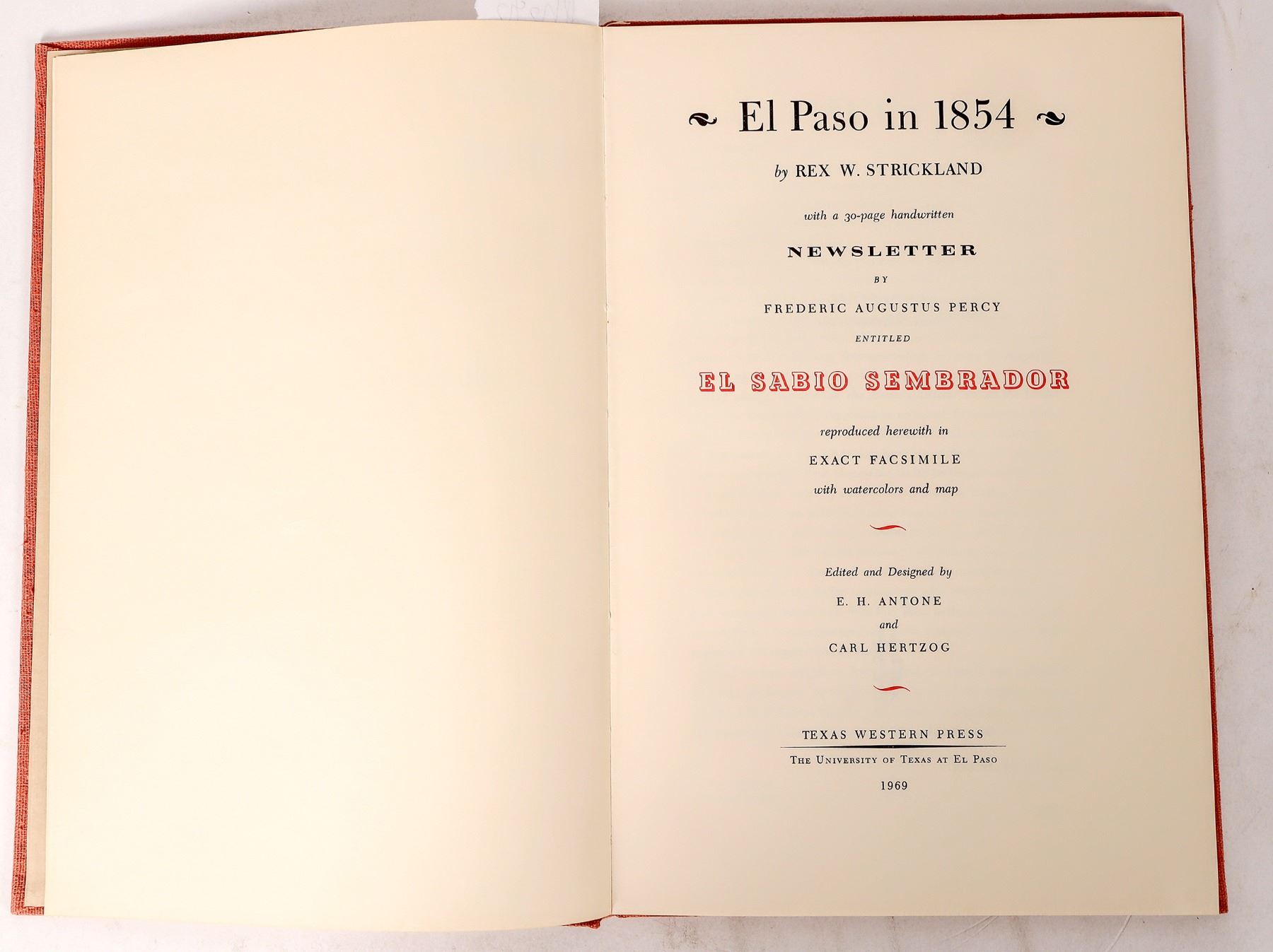1969 El Paso in 1854 by Frederic Augustus Strickland, published by Texas Western Press. Signed by Rex W Strickland, Carl Hertzog and E H Antone. 30pp handwritten newsletter and illustrations. Texas