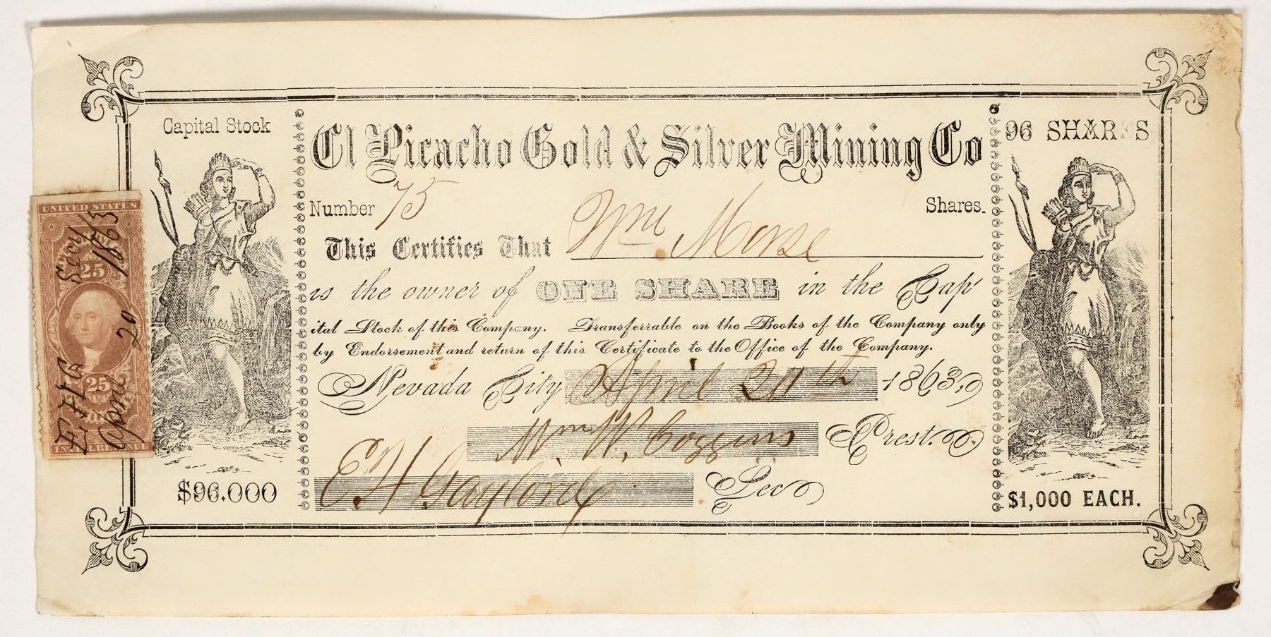 Rare and early. Dateline Nevada City, April 20th, 1863. No. 75, issued for one share to Wm. Morse. Signed by Wm. W. Cozzins, president and secretary E.H. Gaylord. Unusual design with the same allegorical woman vignette on both the right and left sides of the certificate. 25 cent IR stamp on the left. No printer listed. Folds, some toning, creased and stained corners. Not in Filer or other Holabird indexes. No articles found on CDNC. Assessment notices found on newspapers.com, but no production info or more specific location. We have sold this previously as likely a Nevada City mine. Our consignor believes it may be the Picacho Mine located in Imperial County, California.