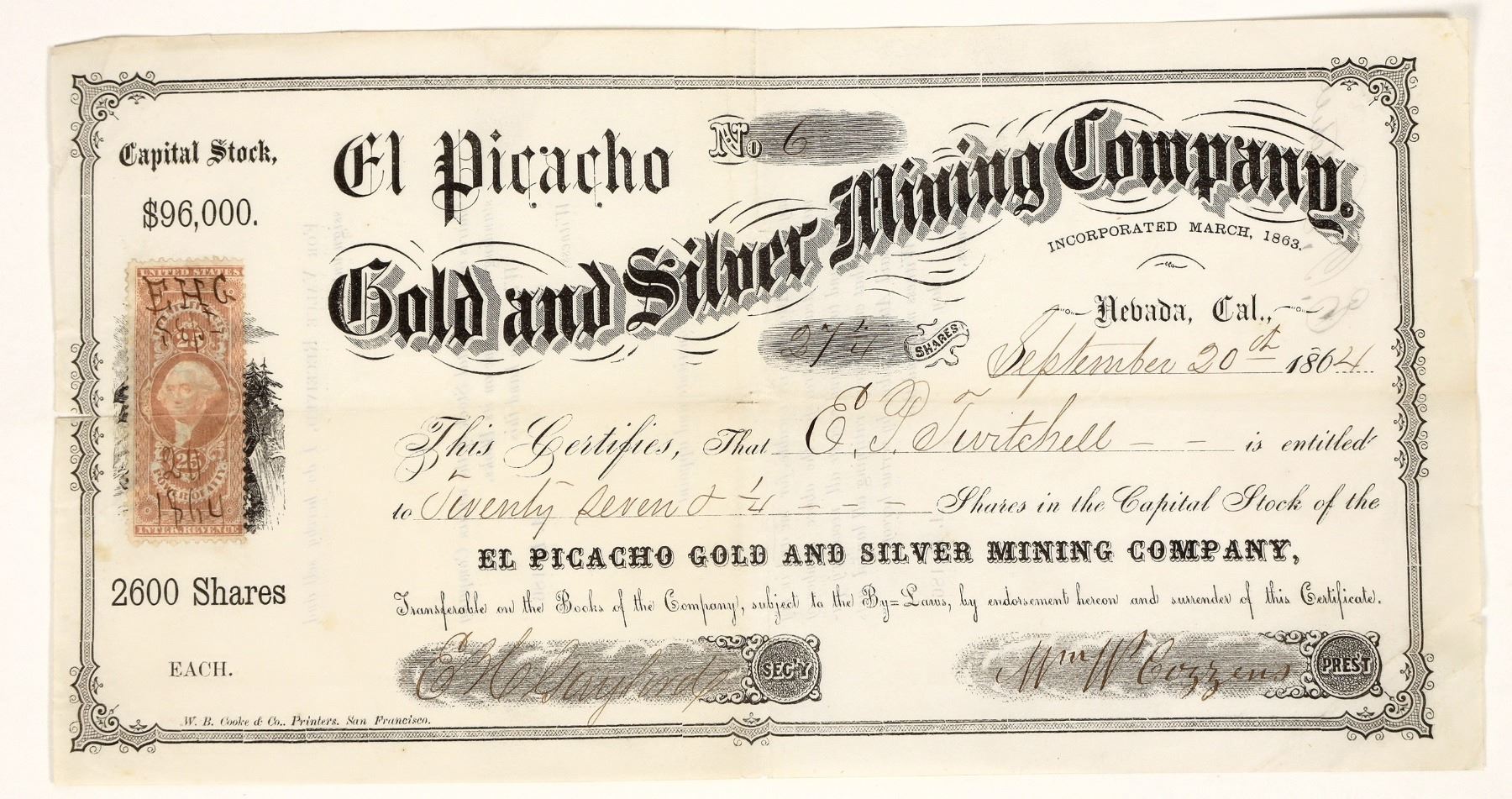 Rare and early. Inc. in March 1863. Ultra low No. 6, issued for 27 shares to EP Twitchill on Sept. 20th, 1864 in Nevada City. Signed by president Wm. W. Coggens and secretary E.H. Gaylord. Not cancelled. Black border and print. Vignette of Native American soldier at left. 25 cent IR stamp at left. Printed by W.B. Cooke & Co. Folds, light wear. 5.25 x 9.75". Not in Filer. No articles found on CDNC. Assessment notices found on newspapers.com, but no production info or more specific location.