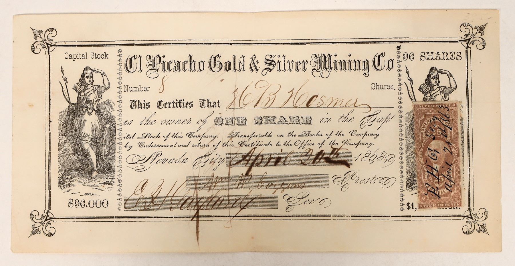 Rare and early. Dateline Nevada City, April 20th, 1863. Low No. 8, issued for one share to H.B. Hosmer. Signed by Wm. W. Cozzins, president and secretary E.H. Gaylord. Unusual design with the same allegorical woman vignette on both the right and left sides of the certificate. 25 cent IR stamp covering most of right vignette. No printer listed. Folds, some toning and soiling, ink showing thru from endorsement on reverse. Not in Filer or other Holabird indexes. H.B. Hosmer was an assemblyman in San Francisco during the 1850s.