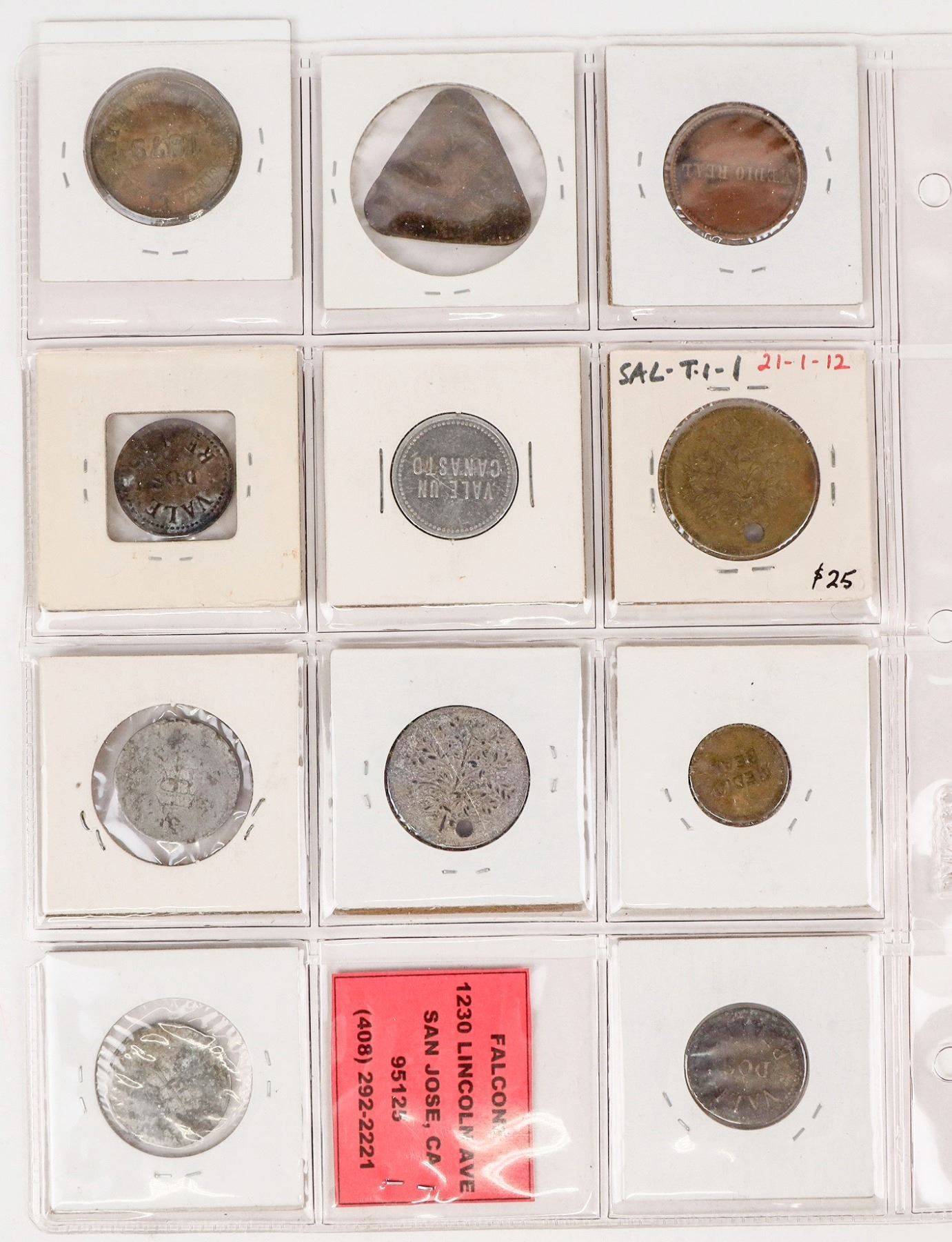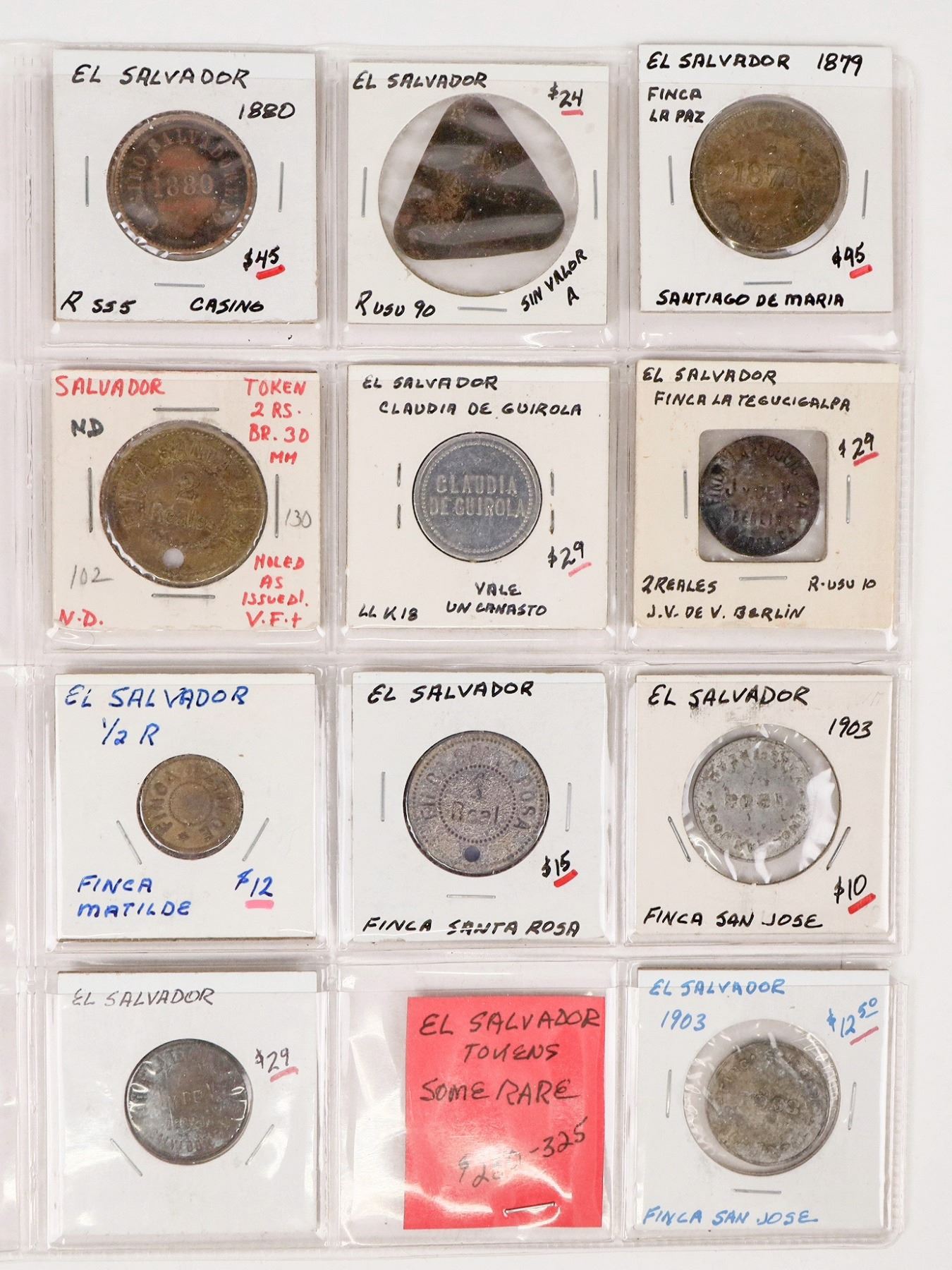 Group of eleven El Salvador tokens, some rare: Sin Valor A; Finca La Paz Santiago De Maria 1879; Claudia De Guirola; Finca La Tegucigalpa; Finca San Jose; Finca Santa Rosa; Finca Matilde; Casino Salvadoreno and more.
