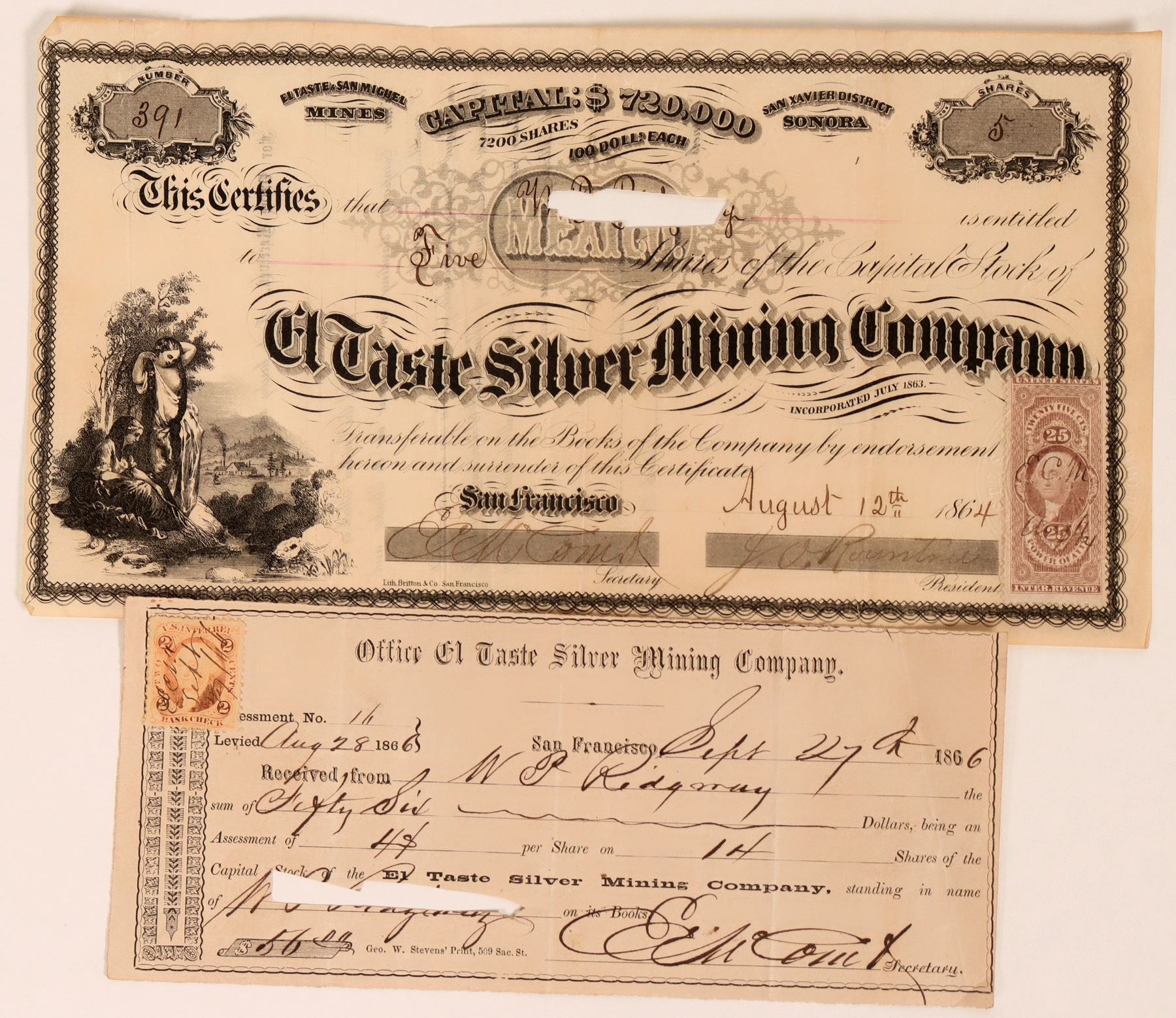 Cert. #391, issued for 5 shares in 1864. El Taste, San Miguel Mines printed at top left. San Xavier District, Sonora printed at top right. Large cut cancel thru the issuer's name at the top. Also, comes with an assessment receipt dated 1866. Allegorical females at left. Twenty-five cent Internal Revenue stamp at bottom right. Britton & Rey, San Francisco. Small tear in bottom border. Uncanceled.