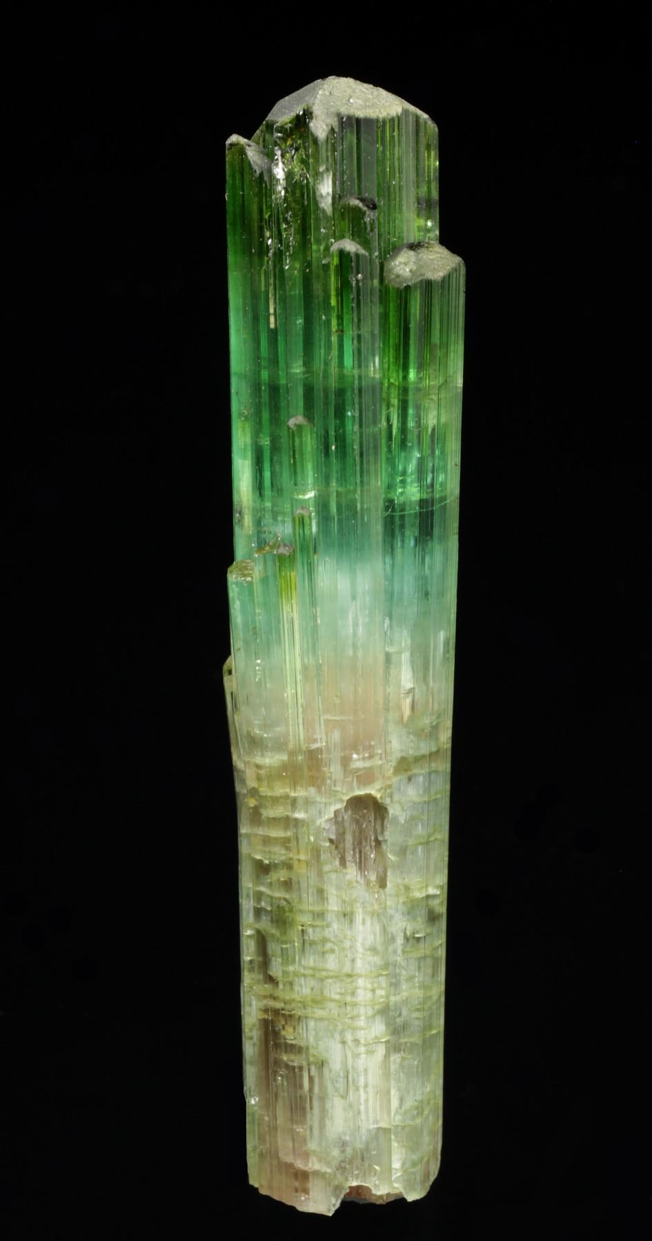 This fine elbaite (tourmaline) specimen from the famous Barra de Salinas District (mouth of Salinas river) in the Coronel Murta district of Minas Gerais, Brazil exhibits some dramatic and attractive color-zonation. The bottom of this prismatic tourmaline crystal features a light pink to yellowish green color and as we move toward the steep termination of the crystal we see a steady gradation from light green to dark green. The luster is good on this specimen and this tourmaline is translucent. Brazilian tourmaline has been famous among collectors and gemologists since the 16th century. Among the oldest and greatest of all Brazilian localities is the district of Barra de Salinas, encompassing a gem-bearing pegmatite swarm that continues to yield superb specimens today. This specimen was formerly in the private collection of a prominent Boston area mineral collector and dealer, Ernie Schlichter (1929-2007). Dimensions (cm): 8.5 H x 1.7 W x 1.6 D. Location: Barra de Salinas District, Coronel Murta, Jequitinhonha Valley, Minas Gerais, Brazil