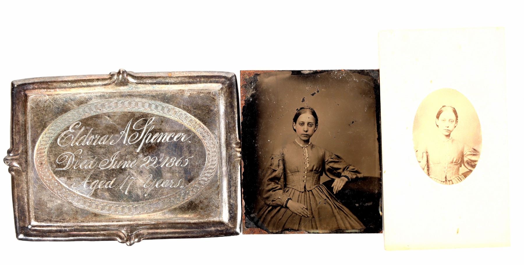 Eldora Spencer died June 22, 1865, aged 17 years. Her silver casket plaque is 4 1/2 x 3 /14 inches. Also are a tin type and a 2 1/2 x 4 inch photo from the studio of G. W. Brookings, Salmon Falls, New Hampshire.