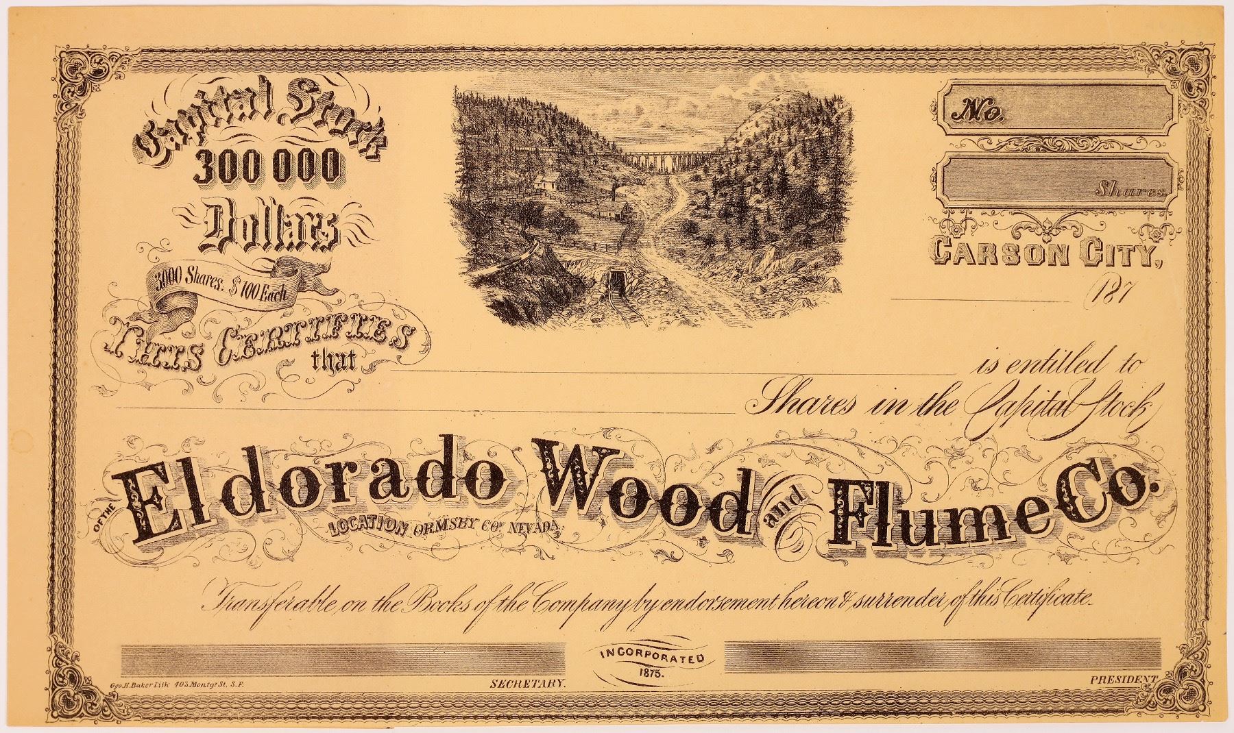 Eldorado Wood & Flume Company Stock- Blank Incorporated 1875, Carson City, Ormsby County, Nevada. Yerington constructed the first flume for sending wood and timber down the mountains; built the Carson yard for the timber and flume companies, including the Eldorado Wood and Flume Company, through which they delivered a large portion of wood and timber for the Comstock mining companies. The flume came into the valley at Brown's Station and Washoe City. Both of these locations were on the V&T Railroad that Yerington was the president of! Vignette of Fluming operation. Printed by Geo. H Baker of San Francisco. The company only had 5,000 authorized shares and we have seen only a couple of issued examples.