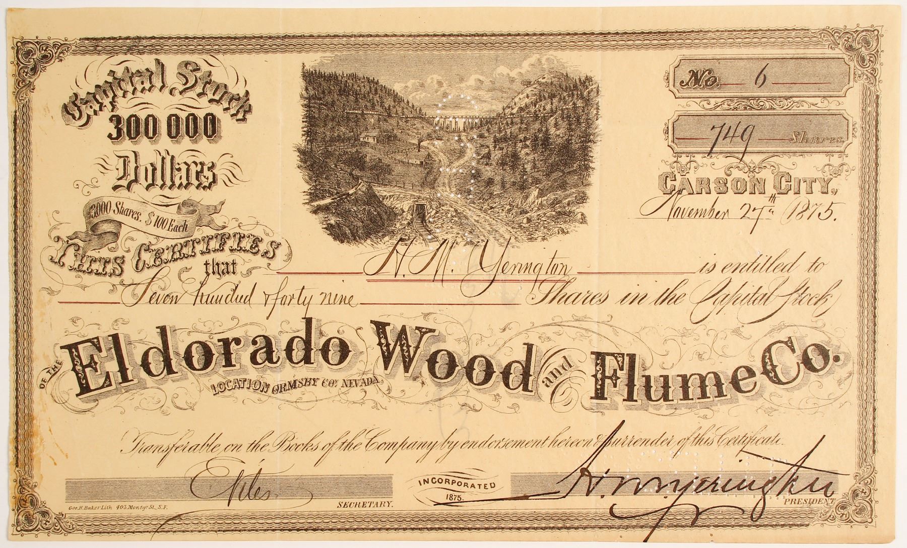 This is a fabulous stock. It is a very early stock number - # 6. It is issued to the founder of the company H, M. Yerington. It is signed by president Yerington. The stock is also endorsed on the back by Yerington! Yerington constructed the first flume for sending wood and timber down the mountains; built the Carson yard for the timber and flume companies, including the Eldorado Wood and Flume Company, through which they delivered a large portion of wood and timber for the Comstock mining companies. The flume came into the valley at Brown's Station and Washoe City. Both of these locations were on the V&T Railroad that Yerington was the president of! #6 for 749 shares to Yerington. Signed by secretary (-iles) and president Yerington. Fluming vignette. Datelined Carson City 1875. Incorporated in 1875. Printed by Geo. H Baker of San Francisco. Fancy scroll work around the title. Cancelled by small holes. Slight staining on lower left. Still a drop dead historically and aesthetic piece! Prag Collection