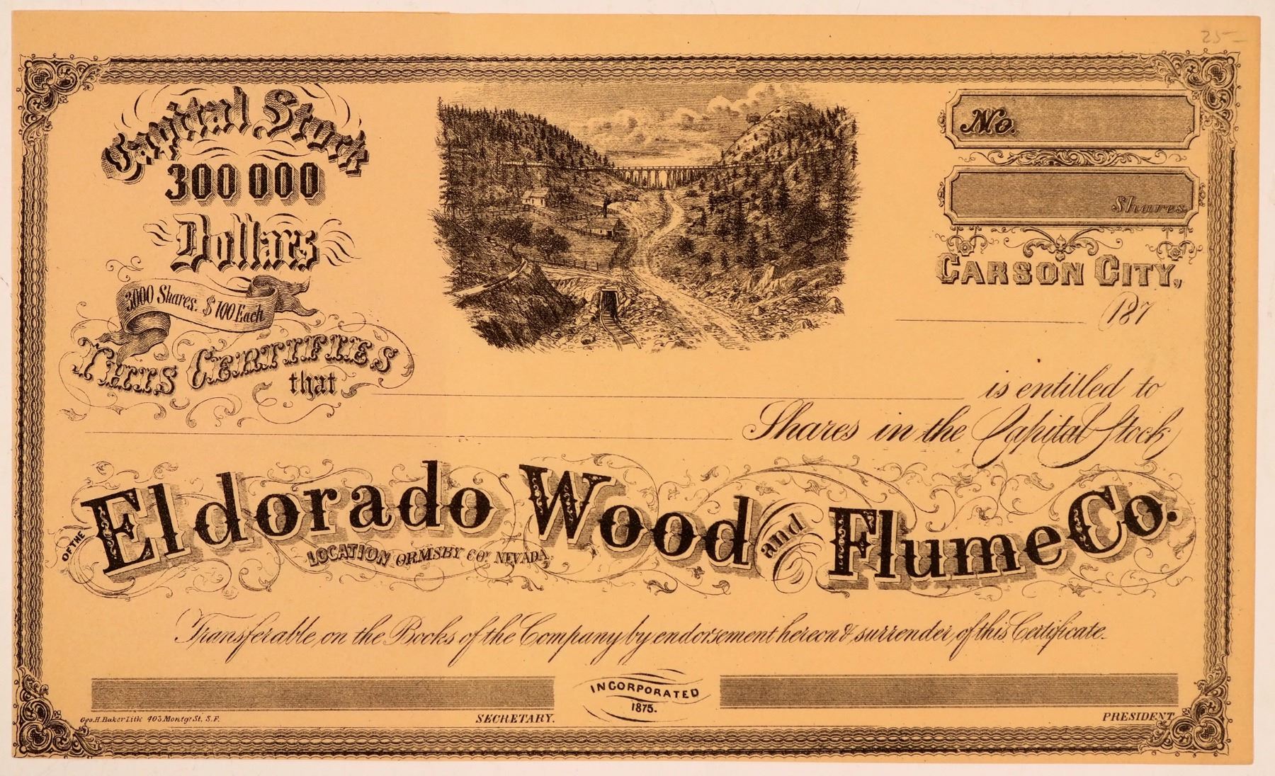 Unissued, but scarce. Inc. in 1875. Black border and print, fluming vignette Geo H. Baker Lith. Stub attached. Heavy toning. 6 x 9.75" HM Yerington constructed the first flume for sending wood and timber down the mountains; built the Carson yard for the timber and flume companies, including the Eldorado Wood and Flume Company, through which they delivered a large portion of wood and timber for the Comstock mining companies. The flume came into the valley at Brown's Station and Washoe City. Both of these locations were on the V&T Railroad that Yerington was the president of! The company also owned timber lands in Markleeville/Hope Valley.