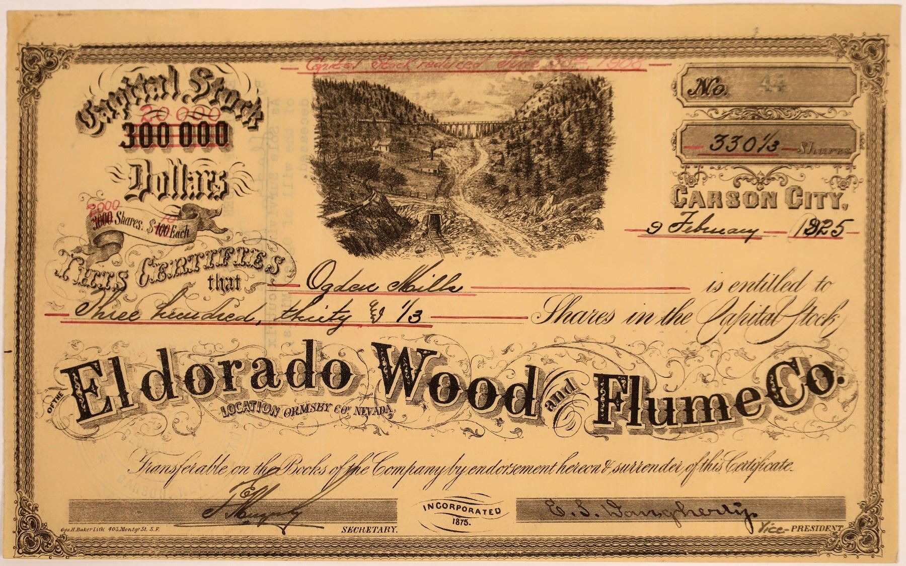 Eldorado Wood and Flume Co. Stock Certificate issued to Ogden Mills (1856-1929), son of capitalist Darius Ogden Mills (1825-1910), Feb 9, 1925. Incorporated in 1875 in Nevada, EDW&F was a major land, wood, and fluming company with vast timber holdings around Lake Tahoe and in Ormsby and Washoe Counties in Nevada. Owned principally by Henry M. Yerington of the Virginia & Truckee Railroad, William Sharon, D. O. Mills, Alexander J. Ralston, and J. W. Haynie. Signed by Enrico Swift Daugherty (b.1861 Watsonville, CA) as President and Frank E. Murphy (1868-1939) as Secretary. Signed on the verso by the Estate of Ogden Mills. Black border, black print on tan paper. Vignette at top center of what appears to us to be Spooner Summit. Measures 10” x 5-3/4”. Excellent condition--see high resolution image online. Rare, historic stock certificate.