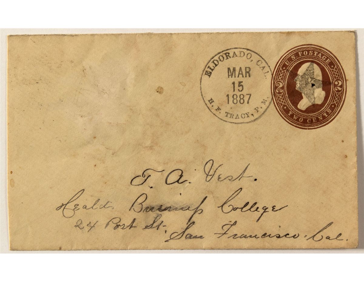 H. F. Tracy is listed on the cancel. Horace F. Tracy was the post master from December 14, 1882 to May 29, 1886. C. F. Roussin was still using the old cancel in March of 1887. Tracy became the post master again on May 29. 1889. Killer is a star. Date 1887 Eldorado, CA hwac 21366